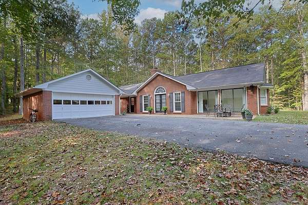 Beautiful Harris County home tucked away on 5 wooded acres. This beautifully maintained single level home offers peaceful privacy. The great room showcases a stunning brick fireplace and vaulted ceilings while the kitchen features granite counters, a breakfast bar, casual dining area, and a pantry. A formal dining room provides extra space for entertaining. The bright sunroom provides flexible space for an office, playroom, or hobby area. 3 generously sized bedrooms and 2 updated baths. The primary suite boasts an ensuite bath with a walk-in tile shower, double vanity, and two walk-in closets. The home is equipped with an in home generator for added peace of mind. Additional highlights include Alexa-compatible smart home features and newly upgraded windows and insulation. A covered breezeway connects the detached two car garage to the home. Two outdoor storage buildings are tucked away for extra space. Experience quiet country living just minutes from town conveniences.