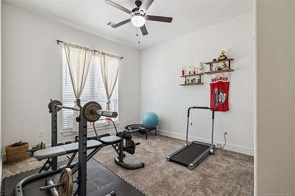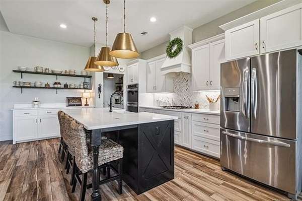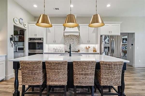 Enjoy open-concept living with custom cabinetry, granite and quartz countertops, porcelain tile flooring, and a gas-starter fireplace. A stylish butler's pantry adds extra functionality for entertaining, while the sophisticated laundry room offers both beauty and practicality. The safe room located in the garage offers peace of mind, and the seamless gutters and covered porch add thoughtful design and function.