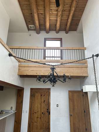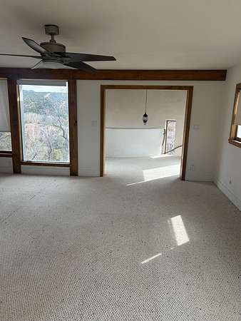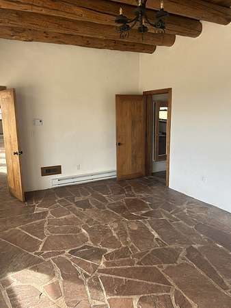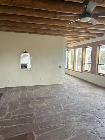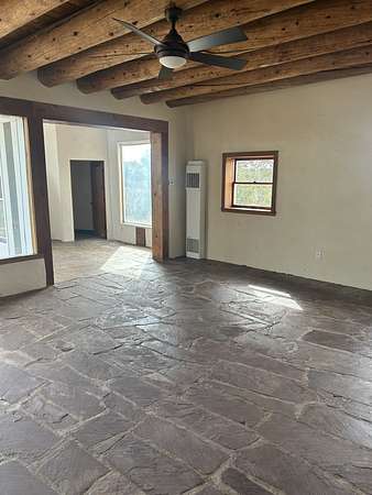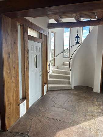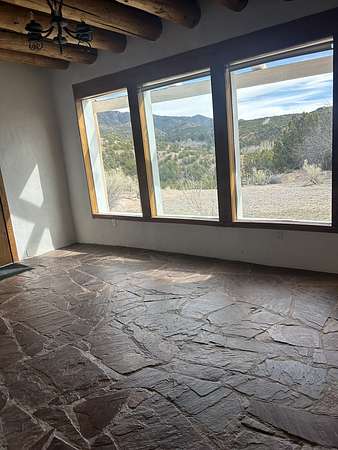 Nestled on 5 acres in the enchanting foothills near Tesuque Village, this uniquely styled home captures the essence of Northern New Mexico living. Located in the quintessential village of Chupadero, the property blends timeless Southwestern charm with breathtaking natural surroundings. Inside, you'll find over 3,100 square feet of thoughtfully designed living space, highlighted by bold vigas, warm flagstone flooring throughout the first floor, and soaring ceilings that extend to the second level. The expansive kitchen and dining area is filled with natural light from dramatic floor-to-ceiling windows, offering both stunning views and passive solar efficiency. The home features two separate living rooms-one on each floor-providing flexibility for entertaining or quiet retreat. With 3 bedrooms and 3 bathrooms, including a convenient ground-floor bedroom, the layout is ideal for multigenerational living or guest accommodations. Step outside and immerse yourself in the beauty of Northern New Mexico. Enjoy direct access to mountain trails right from your backyard, along with sweeping views of the Jemez Mountains and moonrises over the Sangre de Cristo Mountains. At night, the unobstructed skies reveal a dazzling display of stars from every window. Despite its serene setting, the home is just 22 minutes from the historic Santa Fe Plaza and only 5-10 minutes from beloved local destinations like Terra, El Nido, and Tesuque Village Market.