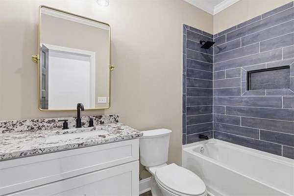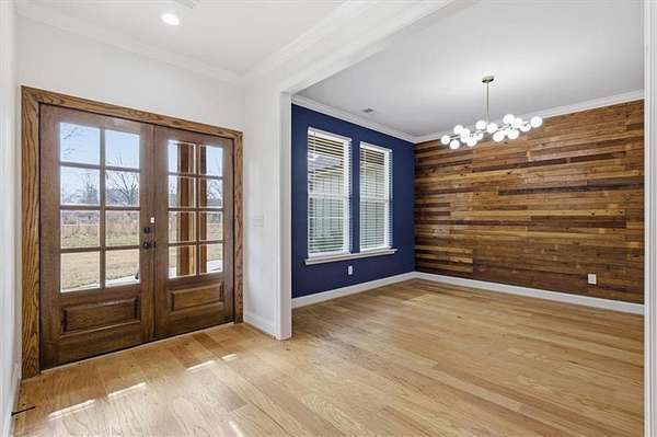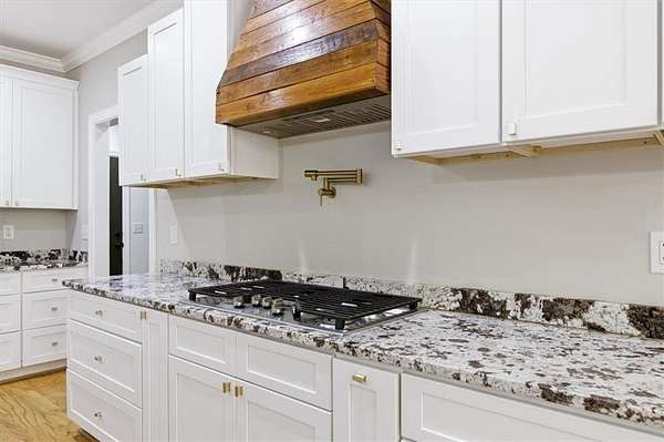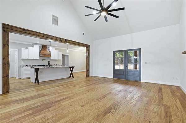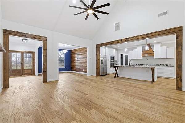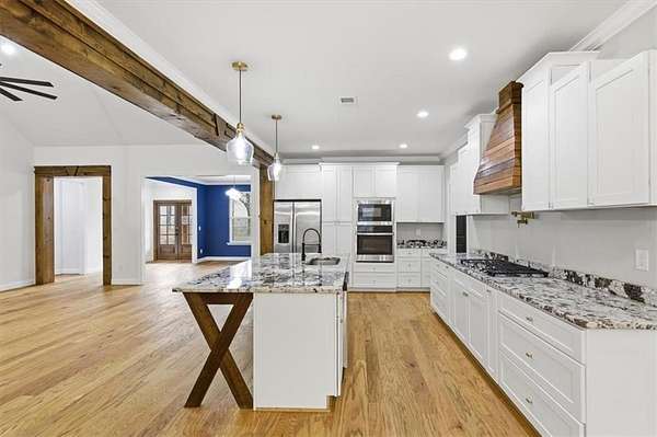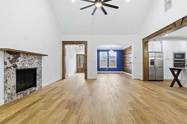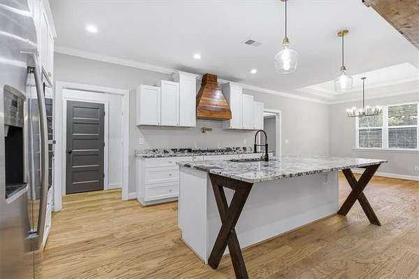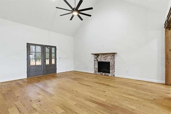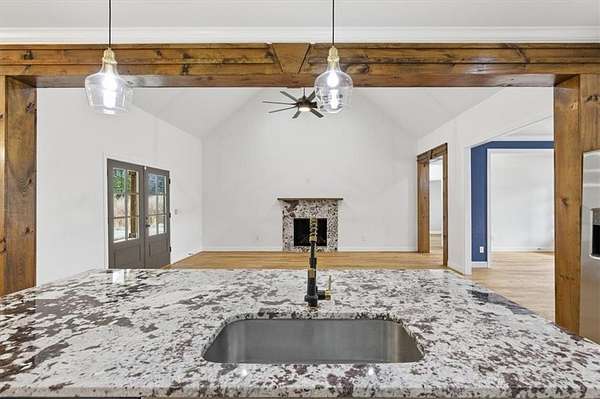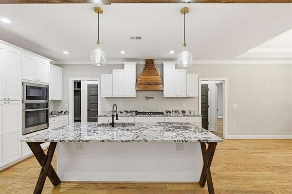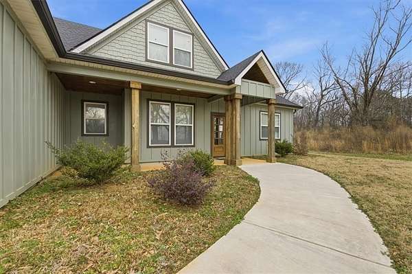 This stunning 5-bedroom, 3-bath home sits on 3.45 acres, offering the ideal blend of modern comfort and peaceful privacy. Built in 2022, the home features an open floor plan with gorgeous wood floors throughout and an inviting layout perfect for everyday living and entertaining. The heart of the home is a chef's dream kitchen-complete with a large island with seating, granite countertops, ample cabinet space, and a pot-filler faucet above the stovetop. A cozy keeping room/breakfast area adds additional space to gather. The main level includes a luxurious owner's suite with a spa-like bath featuring a separate soaking tub and oversized tiled shower, plus a custom walk-in closet with rich wood shelving. Two additional bedrooms and a full bath are also located on the main level. Upstairs, you'll find two more spacious bedrooms-one of which could easily serve as a bonus/media room-and a third full bath. Enjoy the cozy indoor fireplace or relax outdoors under the covered patio, which boasts a second fireplace-perfect for year-round enjoyment. An easy commute to Downtown Carrolton and West Georgia University, this home is a rare find with acreage, style, and space just minutes away from fun, shopping and entertainment.