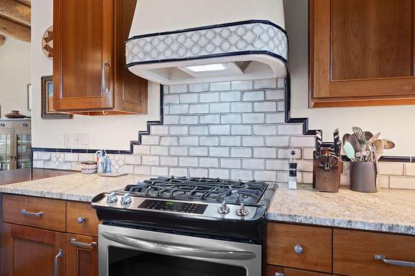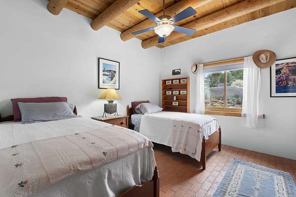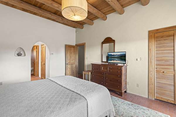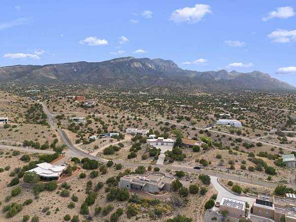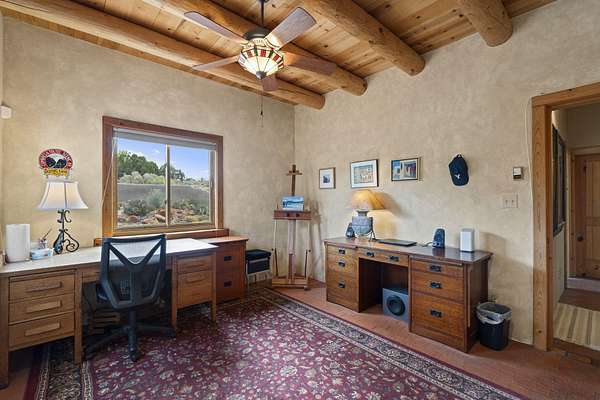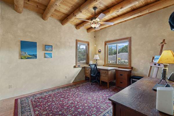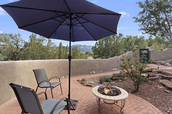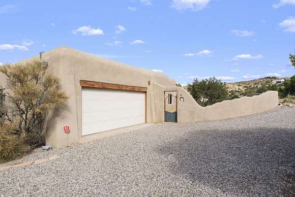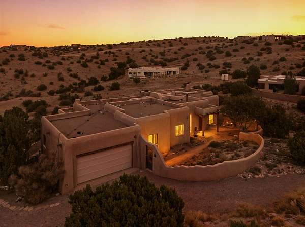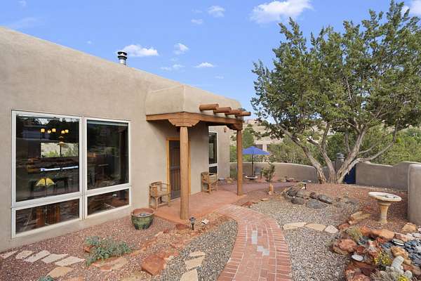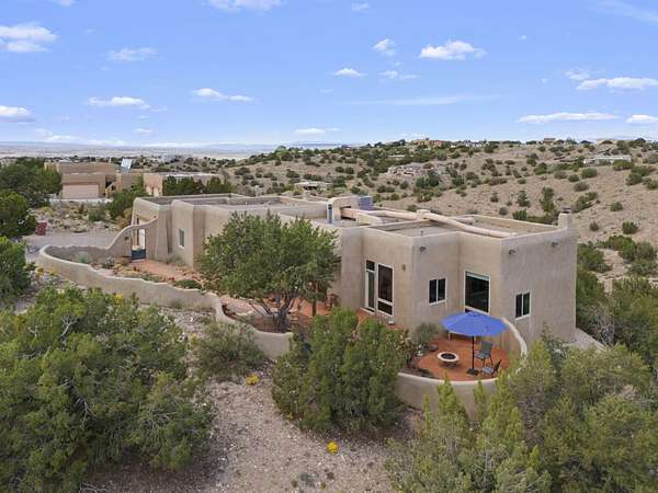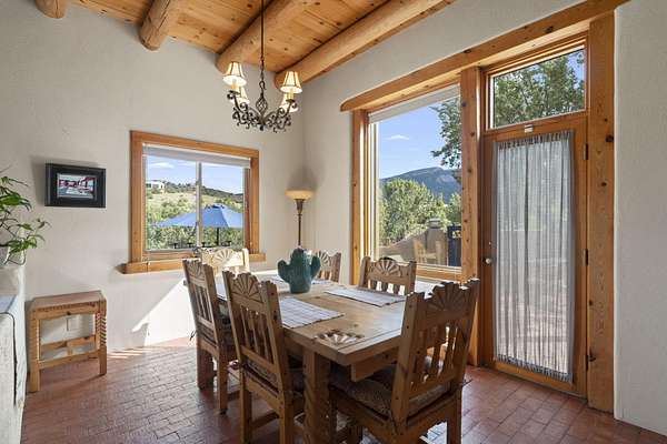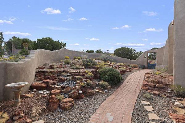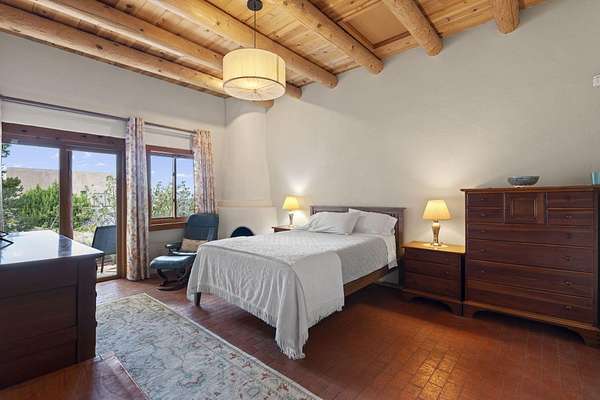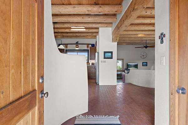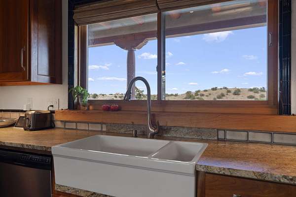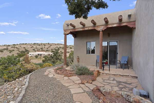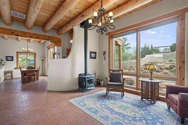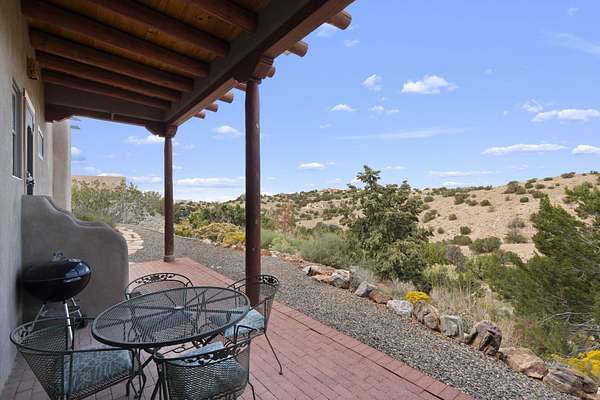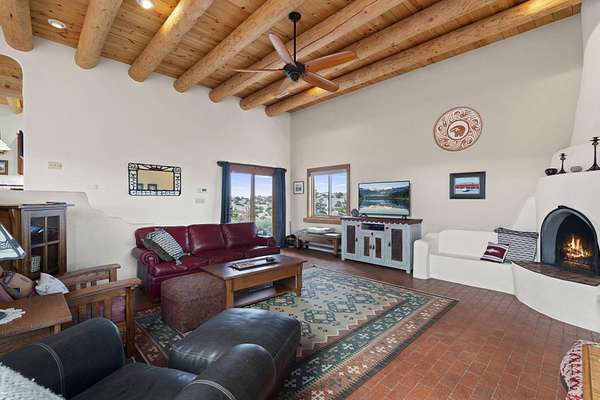 Welcome to an impeccably cared for home! This southwest-style home offers the perfect blend of the southwest design, capturing the landscape and stunning mountain views on 2.53 acres in Placitas, NM! Warm earth tones complement beautiful vigas and beamed ceilings throughout. Interiors are accented by brick flooring throughout, offering durability, aesthetic charm, and a cool surface in warmer months. The updated kitchen features cherry cabinetry, tile backsplashes, a farm sink, and honed granite countertops. The breakfast bar is finished in polished mahogany for a warm, artisanal touch. The living room features a masonry kiva fireplace with bancos, creating a natural focal point and cozy gathering space.
