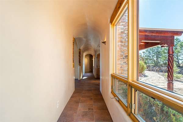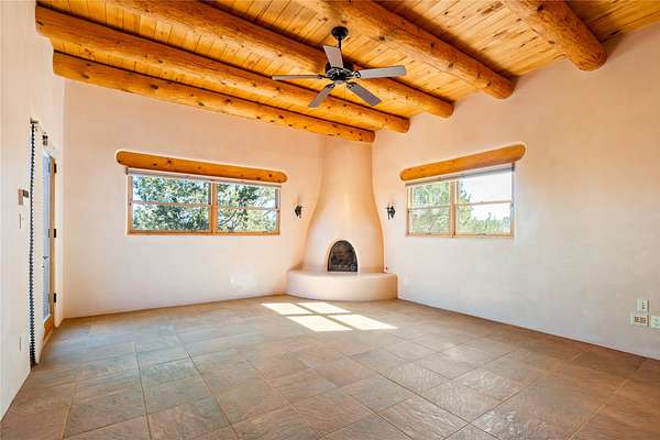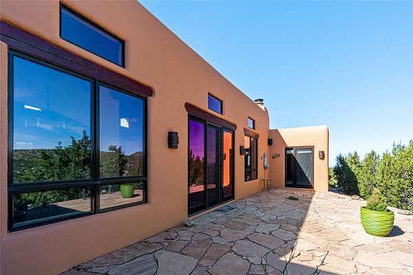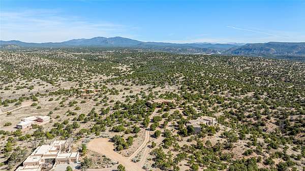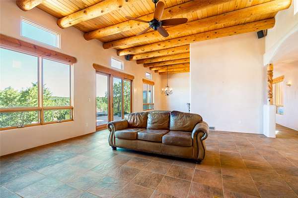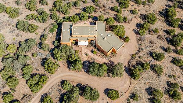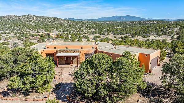 Set on a premier ridge-top lot in The Ridges, this 3.78+/- acre property offers exceptional privacy and sweeping views across nearly 2,000 acres of bordering open space and surrounding mountain ranges. The setting delivers a rare sense of space and quiet while still being conveniently located near the amenities of Eldorado and approximately 25 minutes to the Santa Fe Plaza. Built in 2002 and well-maintained, the 2,433+/- sq ft home features classic Santa Fe architecture with a functional single-level layout. The main living area showcases high ceilings with exposed vigas, a kiva fireplace, and large windows that capture the expansive views, while multiple skylights throughout the home bring in abundant natural light. Hand-carved posts and hard trowel plaster walls in the main living area and primary suite add warmth and craftsmanship throughout. The kitchen opens to the living and dining areas and features custom cabinetry, tile countertops, and a central island, creating an inviting space for everyday living and entertaining. The home offers three bedrooms and a well-balanced layout with one full bath, one 3/4 bath, and one 1/2 bath. The primary suite includes its own kiva fireplace, viga ceilings, and a comfortable, private retreat. Outdoor living is a standout feature, with multiple areas to take in the big skies, sunsets, and surrounding landscape. A new hot tub is included, providing the perfect place to unwind and enjoy the setting. A new roof was installed on September 22, 2025 and includes a 10-year transferable warranty, offering added peace of mind. The oversized finished garage provides flexibility for a workshop, studio, or additional storage. Horses are allowed on the property, with ample space to add facilities if desired. A rare opportunity to own a true ridge-top property with privacy, character, and convenience in one of the area's most desirable settings.