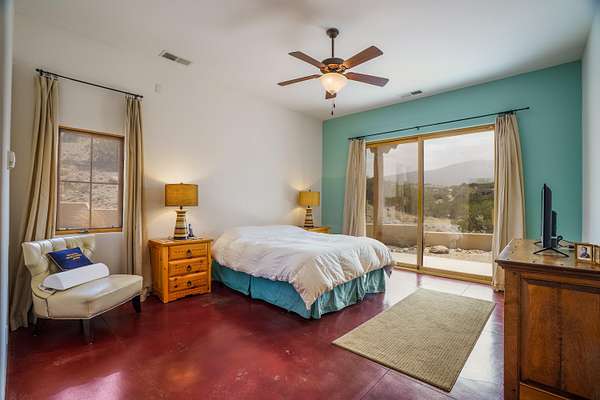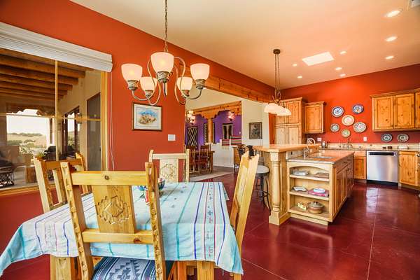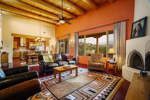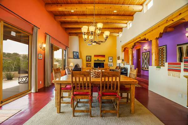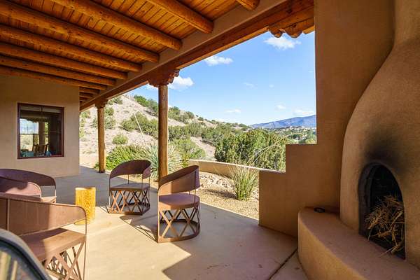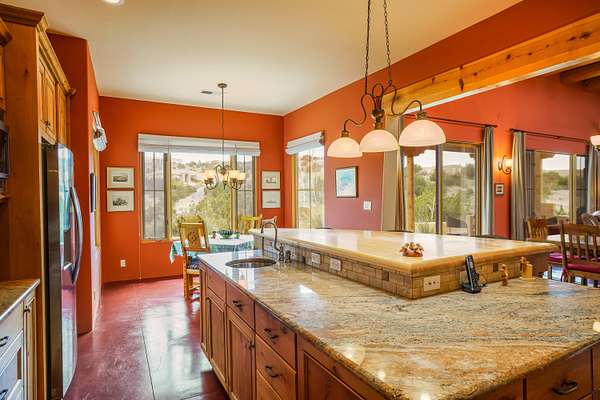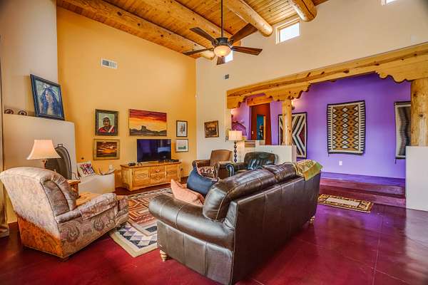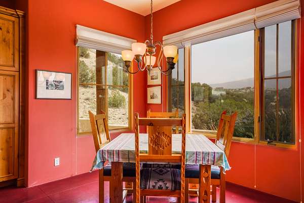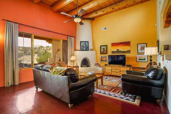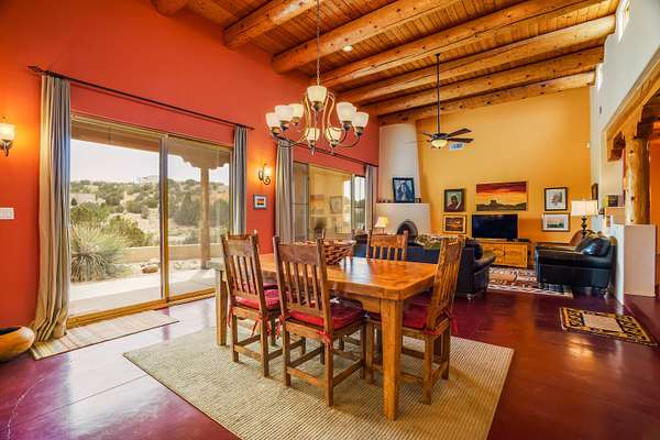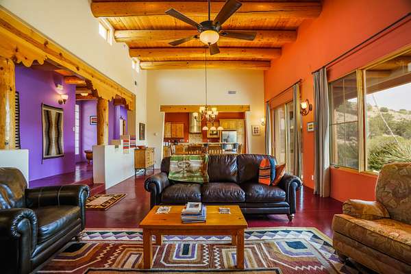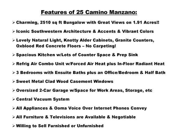 Charming Placitas Bungalow with Great Views on 1.91 Acres! Lovely Southwestern Architecture & Accents with Vibrant Colors, Nicely Accented by Oxblood Red Concrete Floors - No Carpet! An Abundance of Wood Vigas, Corbels, Columns, & Tongue in Groove Details are Complimented by the Warmth of Metal Clad Wood Casement Windows. Wonderful Natural Light from Numerous Windows, Well-Placed Skylights, & North Facing Clerestories. Open Kitchen with Lots of Counterspace plus Spacious Island with Prep Sink. Knotty Alder Cabinetry & Granite Throughout. Refrigerated Air with Forced Air Heat plus In-Floor Radiant Heat. Central Vac & Oversized 2-Car Garage with Space for Workshop or Storage. All Appliances & Ooma VOI Phones Convey! Willing to Sell Furnished. All Furniture & TVs are Available & Negotiable.