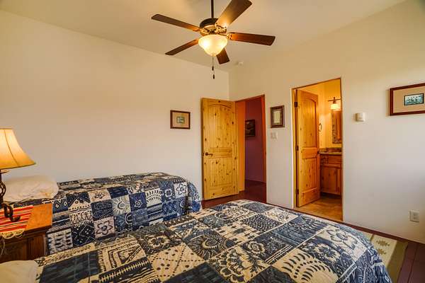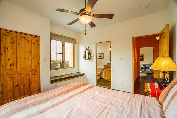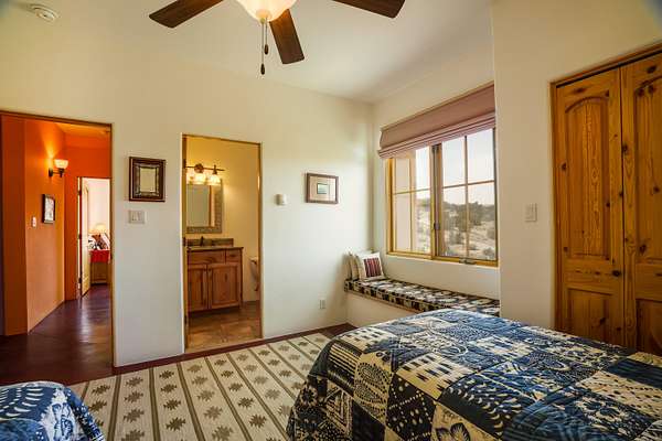 I-25 North to Placitas exit (Hwy 550/165). Turn Right/East on 165 then 1st Left/North on Frontage Rd (just under 1/4 mi). North on Frontage Rd about 1.6 mi to Camino Manzano. Right/East on Camino Manzano & go about 2.1 mi to driveway on RH/South side of road. Take the RH Fork of the Driveway as you go Up the Hill.