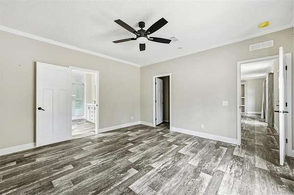 The oversized primary suite is a true retreat, complete with a spa-like bathroom featuring a freestanding soaking tub, separate shower, and a private toilet room for added comfort. Every bedroom includes its own walk-in closet, providing generous storage space throughout the home.