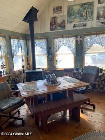 Live like you're on vacation year round! This rustic yet modern retreat is ready for it's next owner. Incredible views from every spot in the house. Over 8 wooded acres with plenty of wildlife and a spring fed pond plus snowmobile and 4 wheeler trails. Ideal hunting camp-just walk out your back door! Many recent updates including a water softener, new well pump, fuel tank and new wood stove. Refinished hardwoods throughout. Partially finished attic space can easily be converted to living space. Lots of storage in the barn plus one car detached garage. Incredibly low taxes--less than $1000!