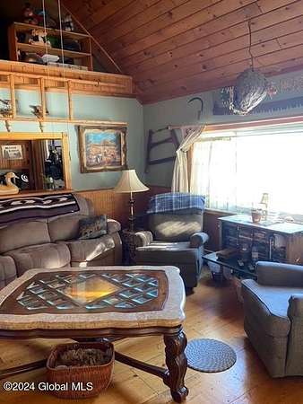 NEW YEAR, NEW PRICE! Live like you're on vacation year-round! This rustic yet modern retreat is ready for its next owner. Incredible views from every spot in the house. Over 8 wooded acres with plenty of wildlife and a spring fed pond plus snowmobile and 4-wheeler trails. Ideal hunting camp-just walk out your back door! Many recent updates including a water softener, new well pump, fuel tank and new wood stove. Refinished hardwoods throughout. Partially finished attic space can easily be converted to living space. Lots of storage in the barn plus one car detached garage. Incredibly low taxes--less than $1000!