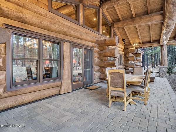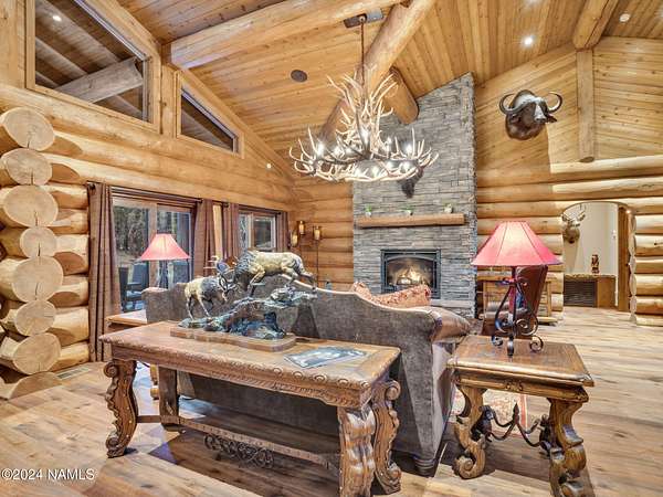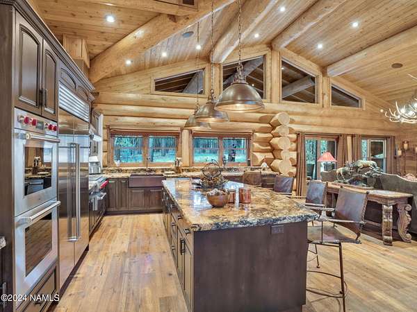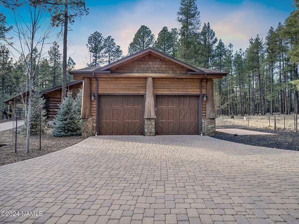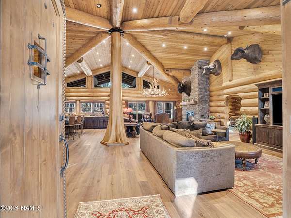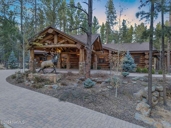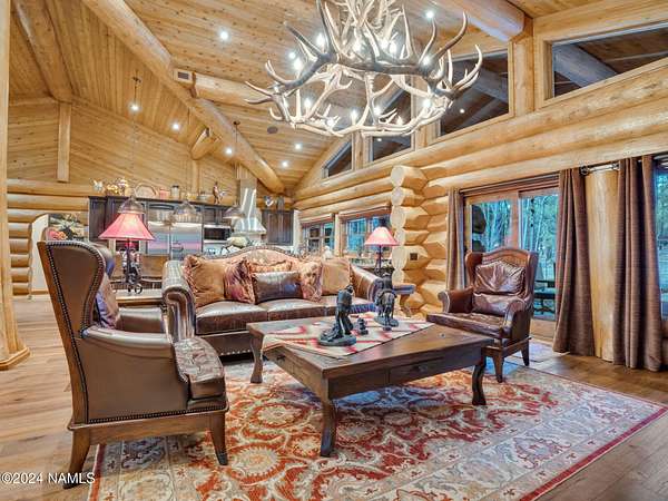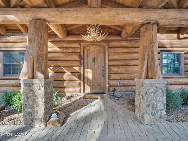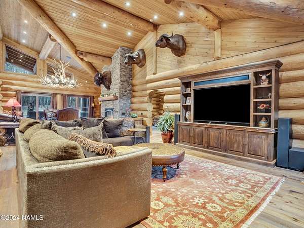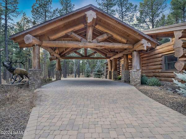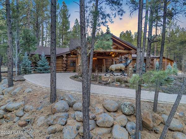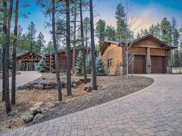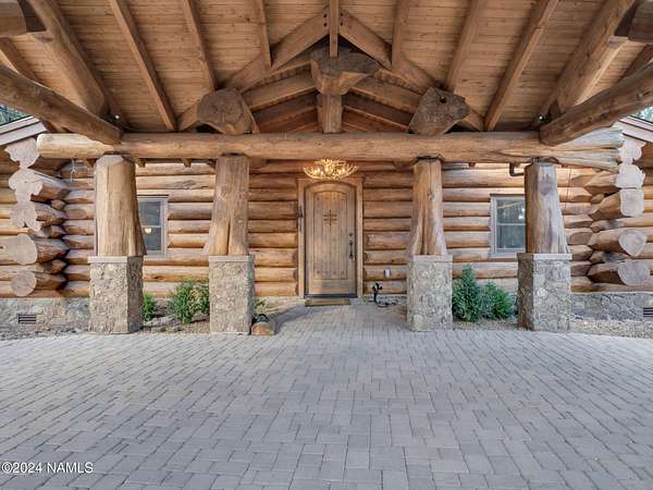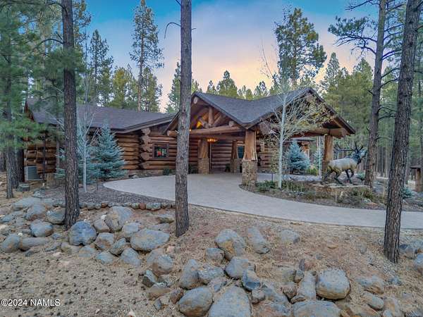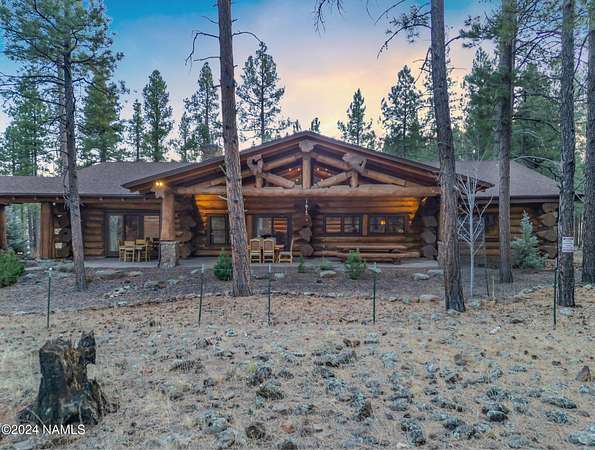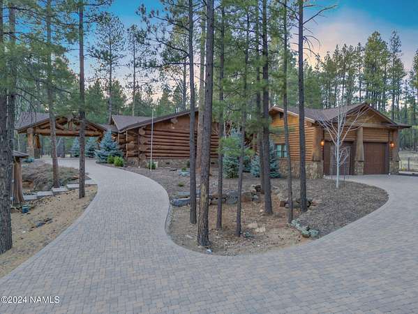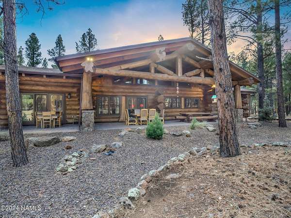 THE ULTIMATE MOUNTAIN LIVING EXPERIENCE AWAITS IN THIS ABSOLUTELY STUNNING, HANDCRAFTED FULL-SCRIBE LOG HOME. Nestled gracefully among the towering ponderosa pines, this extraordinary property offers unparalleled tranquility and direct access to the National Forest, literally backing up to endless wilderness. This is more than a home; it's a sanctuary designed for the ultimate mountain lifestyle. This classic, custom-built ranch-style log home spans an impressive 3,000 square feet, offering three spacious bedrooms and an atmosphere of rustic elegance. The quality and craftsmanship were so exceptional that the home was proudly featured in the highly coveted ''Curb Appeal'' issue of Log Cabin Homes Magazine. Every element of this residence was chosen with an uncompromising dedication to excellence and no expense was spared in its construction. The structure itself is built from massive, hand-selected Western Red Cedar logs, a testament to enduring quality and natural beauty. Step inside and be greeted by the warmth of genuine oak flooring that extends throughout the main living areas, perfectly complementing the rustic aesthetic. The heart of the great room is a spectacular, floor-to-ceiling fireplace crafted from exquisite Wapiti Rock, creating a stunning focal point and a cozy gathering place for those cool mountain evenings. Seamlessly blending indoor comfort with the majestic outdoors, the home features an expansive 750-square-foot covered patio. This magnificent outdoor living space is an ideal spot for al fresco dining, entertaining guests, or simply relaxing while soaking in the sights and sounds of the surrounding forest. The kitchen is a true culinary haven, designed for both functionality and fellowship. It boasts a wide-open concept, providing clear sightlines into the rest of the house, making it the central hub for family and guests. It is outfitted with top-of-the-line Wolf appliances, known for their performance and durability. Expansive granite countertops offer ample workspace, surrounding a large eat-in island that comfortably seats four people. A unique and charming feature of this space is the "Family Tree"--a single, massive timber that rises through the kitchen to support the roof structure, symbolizing strength and connection. Abundant natural light floods the area through numerous windows, creating a bright, welcoming environment unlike any other. This is a rare opportunity to own a piece of architectural art in a truly coveted location. Please book your very own private tour today and step into the mountain home you've always dreamed of.
