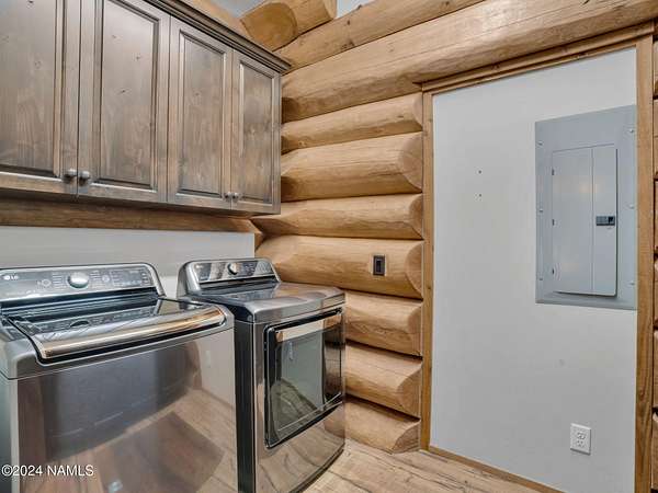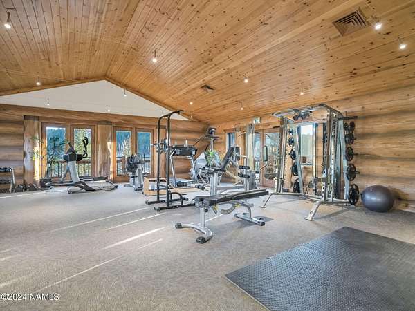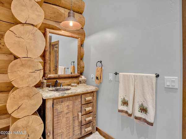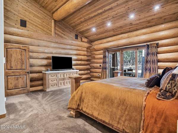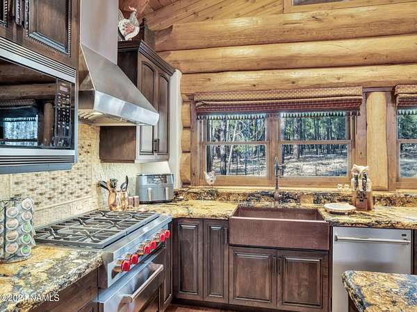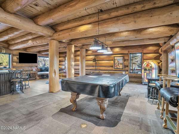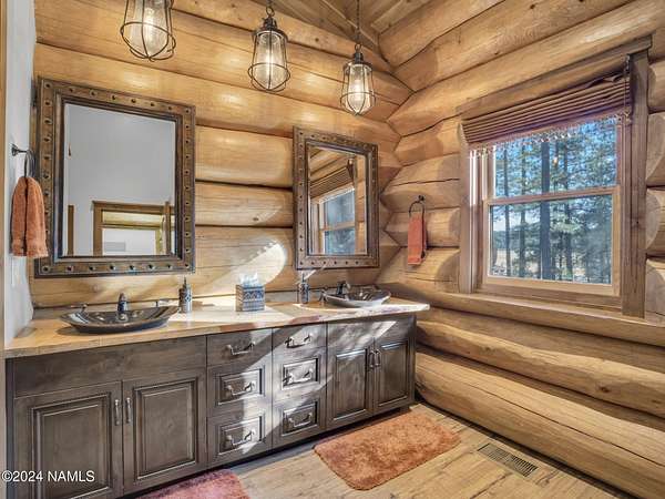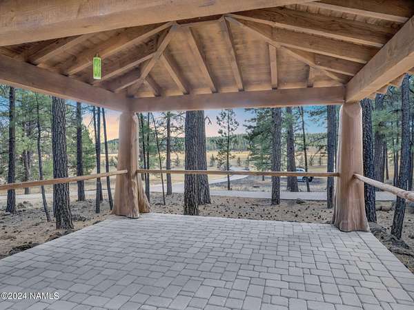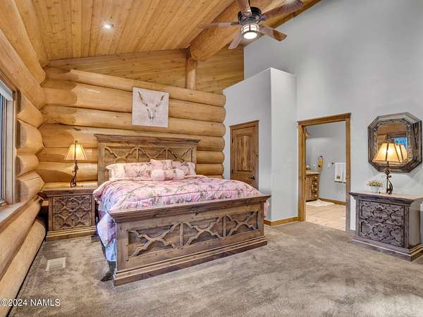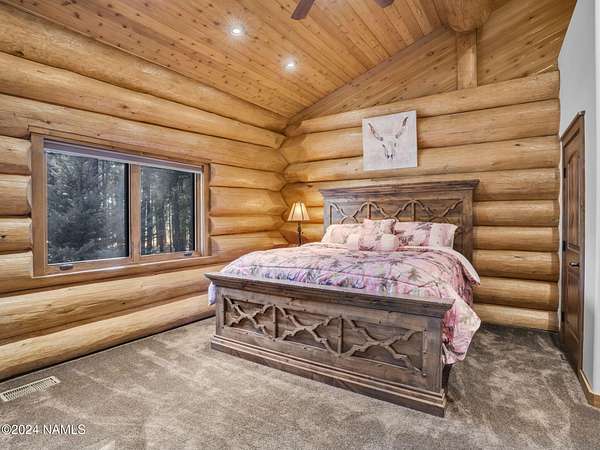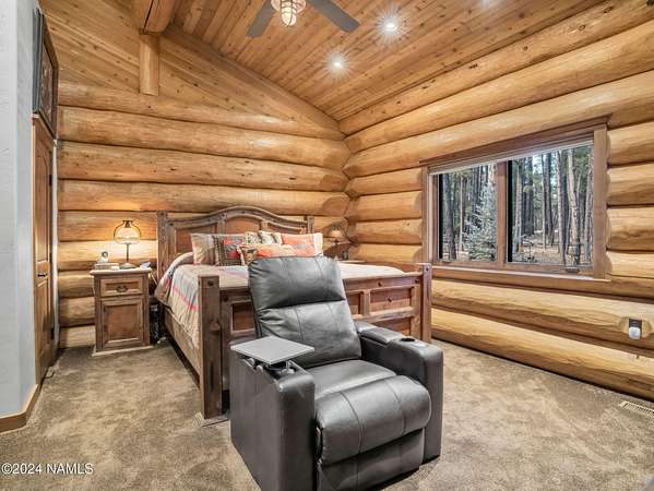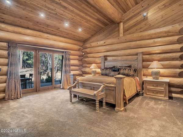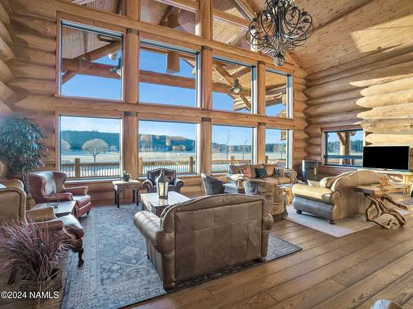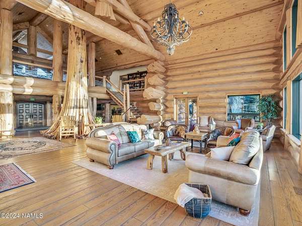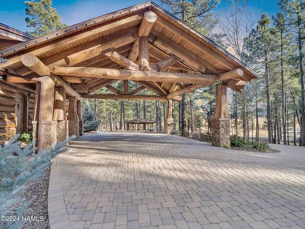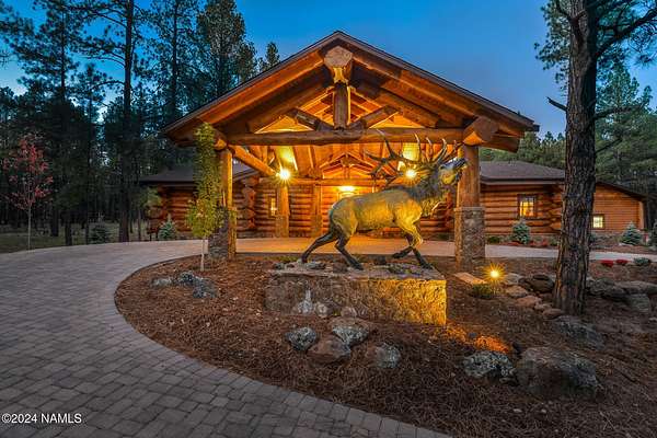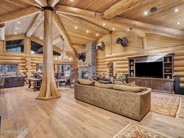 THE ULTIMATE MOUNTAIN LIVING EXPERIENCE AWAITS IN THIS ABSOLUTELY STUNNING, HANDCRAFTED FULL-SCRIBE LOG HOME. Nestled gracefully among the towering ponderosa pines, this extraordinary property offers unparalleled tranquility and direct access to the National Forest, literally backing up to endless wilderness. This is more than a home; it's a sanctuary designed for the ultimate mountain lifestyle. This classic, custom-built ranch-style log home spans an impressive 3,000 square feet, offering three spacious bedrooms and an atmosphere of rustic elegance. The quality and craftsmanship were so exceptional that the home was proudly featured in the highly coveted ''Curb Appeal'' issue of Log Cabin Homes Magazine. Every element of this residence was chosen with an uncompromising dedication to excellence and no expense was spared in its construction. The structure itself is built from massive, hand-selected Western Red Cedar logs, a testament to enduring quality and natural beauty. Step inside and be greeted by the warmth of genuine oak flooring that extends throughout the main living areas, perfectly complementing the rustic aesthetic. The heart of the great room is a spectacular, floor-to-ceiling fireplace crafted from exquisite Wapiti Rock, creating a stunning focal point and a cozy gathering place for those cool mountain evenings. Seamlessly blending indoor comfort with the majestic outdoors, the home features an expansive 750-square-foot covered patio. This magnificent outdoor living space is an ideal spot for al fresco dining, entertaining guests, or simply relaxing while soaking in the sights and sounds of the surrounding forest. The kitchen is a true culinary haven, designed for both functionality and fellowship. It boasts a wide-open concept, providing clear sightlines into the rest of the house, making it the central hub for family and guests. It is outfitted with top-of-the-line Wolf appliances, known for their performance and durability. Expansive granite countertops offer ample workspace, surrounding a large eat-in island that comfortably seats four people. A unique and charming feature of this space is the "Family Tree"--a single, massive timber that rises through the kitchen to support the roof structure, symbolizing strength and connection. Abundant natural light floods the area through numerous windows, creating a bright, welcoming environment unlike any other. This is a rare opportunity to own a piece of architectural art in a truly coveted location. Please book your very own private tour today and step into the mountain home you've always dreamed of.