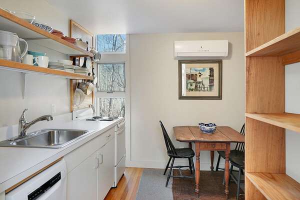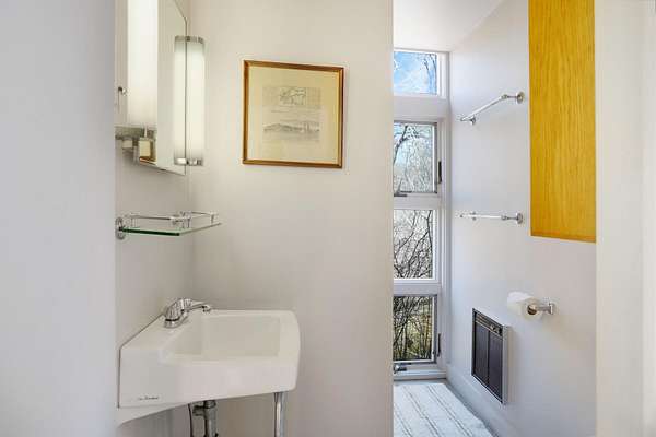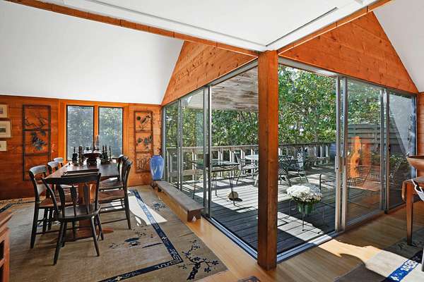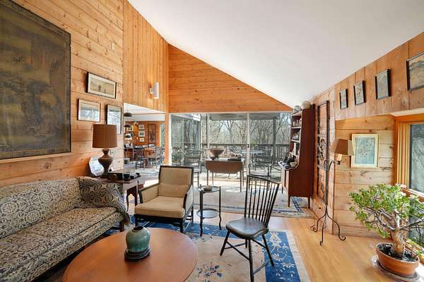 Perched atop Fulling Mill Hill this distinctive contemporary main house plus guest house offers mid-century charm and a serene retreat set on 3.3 acres of mature oak and beech forest and bordered by an ancient stone wall. Designed by renowned Yale School of Architecture Dean Paul Mitarachi, the main house features a striking circular entryway framed by mature Asiatic gardens. Step inside to discover a custom circular staircase with dramatic floor to ceiling windows, leading to the upper living area flooded with natural light from the wall of south-facing windows. The living area with high ceilings and woodstove is a comfortable place to congregate, while the kitchen and open dining areas lend themselves to modern day living. Glass sliding doors open onto a spacious 2nd story deck giving the entire living space an intimate relationship with the outdoors. On the first floor there are three total bedrooms; two bedrooms sharing a full bath plus a primary bedroom with a full bath en-suite. Total square footage represents house (1,400 sq. ft.) and guest house (518 sq. ft.). A shared six (6) bedroom septic system services both houses. 2 miles to Lucy Vincent beach