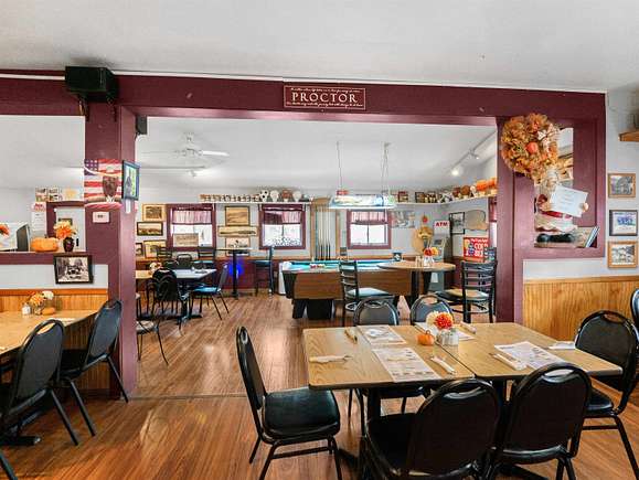 Franklin's Restaurant has been a generational gathering place in the historic town of Proctor, attracting a loyal local following with its small town warmth and welcoming atmosphere reminiscent of a certain popular TV show. Anchoring an important part of the town's social life, the almost 4000 square foot building, complete with two income producing apartments, sits on a 5.66 Acre parcel. This opportunity can also be purchased (found at MLS#5030232) for a total of $599,000 with the addition of the contiguous 11.12-Acre property, the historic Sutherland Falls Quarry, whose unique beauty opens the door to several other income possibilities. These would include expanded outdoor catering capabilities and residential development/subdivision. The Restaurant and Multi-family building are available with just the 5.66 acres alone as listed here for $499,000. The Restaurant itself, with innumerable upgrades (list found separately) seats 72 people plus outdoor seating and is a complete and functioning turnkey operation with a loyal staff, convivial atmosphere, wood floors, pool table, attractive bar and state of the art kitchen. Inventory and all furnishings are included in the transfer. Come inspect this promising opportunity today!