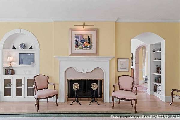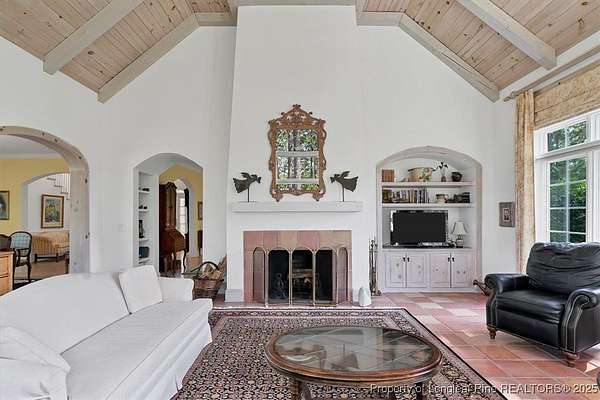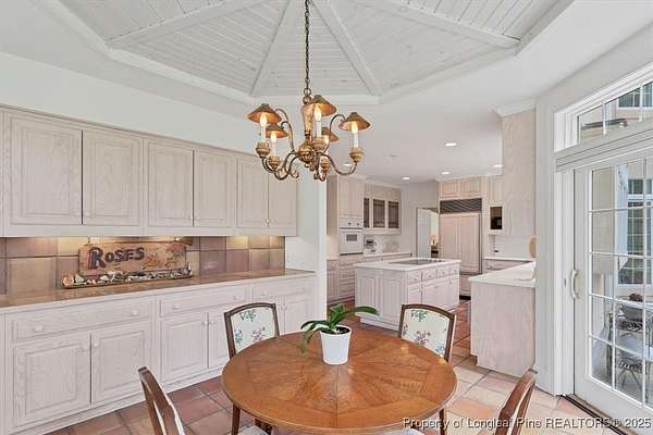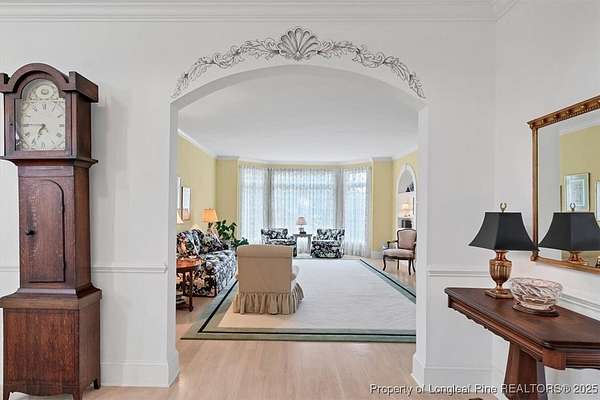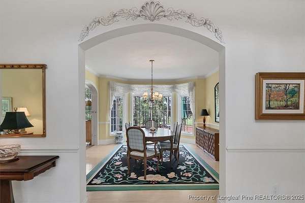 Situated just inside the gates of the prestigious Country Club of North Carolina (CCNC), this stately residence offers refined Southern living on a beautifully landscaped 1.5-acre lot. Perfectly positioned on the 4th tee of the acclaimed Cardinal Course, the home captures commanding views of two serene ponds and rolling fairways-providing a stunning backdrop for everyday life. Inside, over 5,000 square feet of elegant living space welcomes you with a soaring two-story foyer and sweeping staircase. Natural light floods the interiors through expansive custom windows, highlighting the craftsmanship and timeless design. The dramatic family room features a vaulted pickled wood ceiling, fireplace, and floor-to-ceiling windows that seamlessly connect indoors with nature. The chef's kitchen is both charming and functional, featuring a Dutch door, Frank Lloyd Wright-inspired stained glass cabinetry, and fine detailing throughout. Ideal for entertaining or quiet evenings, the home includes a formal living room, two fireplaces, and an expansive terrace perfect for outdoor gatherings. Designed with flexibility in mind, the home includes two luxurious primary suites-one on each level. The main-level suite offers dual en-suite baths and peaceful views. Additional features include a second staircase, three-car garage, and a spacious unfinished basement with endless possibilities. Located within one of the South's most exclusive private communities, CCNC residents enjoy access to two nationally ranked golf courses-the Dogwood and Cardinal-as well as a newly renovated clubhouse, tennis and pickleball courts, a lakefront pool, and fine dining. Known for its tradition, beauty, and community, CCNC offers a lifestyle like no other. Elegant, private, and full of potential, this exceptional property invites you to create your dream home in one of North Carolina's most coveted settings.