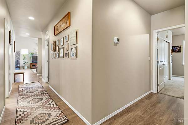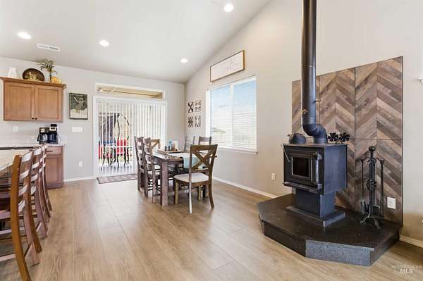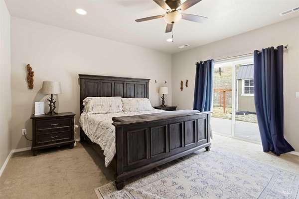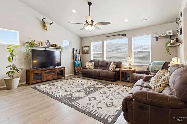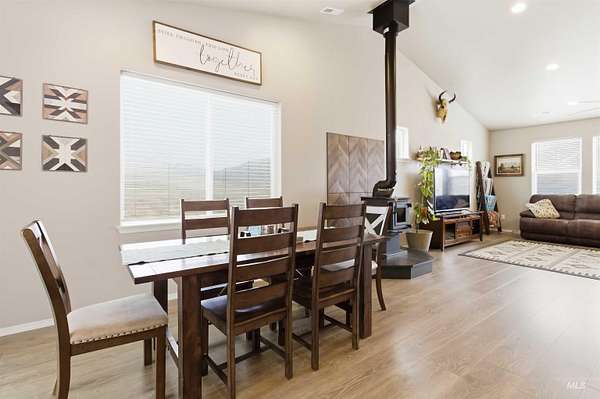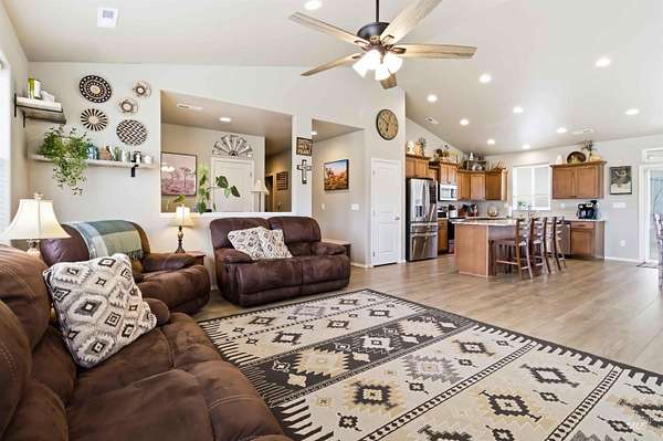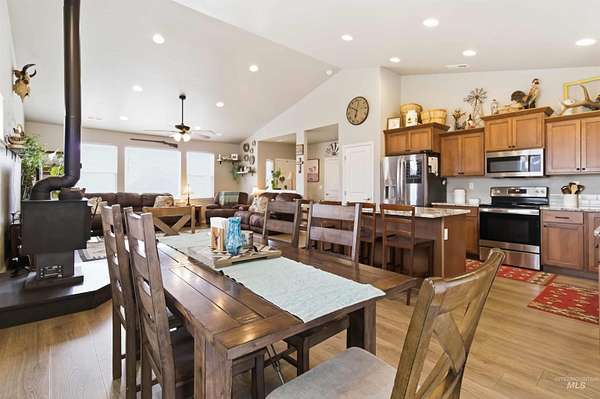 Breathtaking custom-built home on 3.7 acres with 360-degree mountain views overlooking the Payette River. Constructed in 2021, this 2,052 sq. ft. residence offers a bright, open-concept floorplan with vaulted ceilings, engineered hardwood floors, knotty pine accents, stacked stone wood-burning fireplace, and walls of windows framing panoramic scenery. The gourmet kitchen is a chef's dream with a large custom granite island and solid surface countertops, custom cabinetry, designer tile, and pantry. The flexible floorplan includes 4 bedrooms and central laundry room. The luxurious main suite features a spa-like bath with soaking tub, walk-in shower, dual vanities, and an oversized closet. Enjoy Idaho mountain living from the covered patio while watching wildlife or taking in views of Bogus Basin. The property includes an expansive three car garage with RV parking, and is horse-friendly. Located just 30 minutes to Eagle with HOA private river access, this home perfectly blends adventure, comfort, and tranquility. A must see property close to all your outdoor recreation fun!