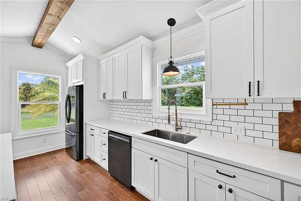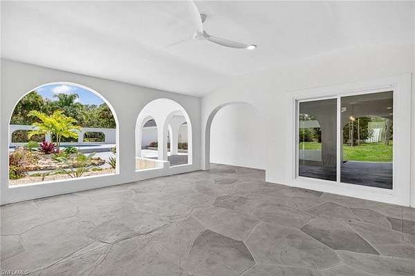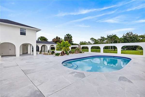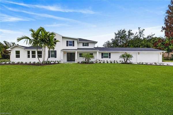 5 ACRES OF 100% UPLANDS! Tucked within Golden Gate Estates, this fully reimagined 4-bedroom + den, 4.5-bath estate spans approximately 4,500 square feet across a private, professionally landscaped five-acre parcel. The approach is clean and confident, with a fresh Alabaster exterior, black shutters, new carriage lighting, and a wood plank entry ceiling setting the tone. Inside, the home has been thoughtfully refined. Walls have been retextured, the palette simplified, and every space feels intentional without trying too hard. Natural light moves easily through the main living areas, where vaulted wood beam ceilings and a redesigned fireplace create a strong central presence. Just off the living space, a well-placed dry bar with wine storage and beverage refrigeration makes everyday living and entertaining feel seamless. The kitchen is crisp and functional, with white shaker cabinetry, stainless steel appliances, and a comfortable dining area that anchors the space. Behind the scenes, the work is just as thorough. Roof, mechanicals, water system, and exterior components have all been addressed, giving the home a true sense of readiness. The primary suite is generous, with a fully reworked bath featuring dual vanities, soaking tub, and separate shower. Secondary spaces follow suit with clean, updated finishes throughout. Outdoors, the setting shifts into a private tropical environment. The pool and hardscape have been refreshed, while new landscaping introduces depth, structure, and privacy across the property. A three-car garage, updated lighting, and finished auxiliary spaces round out a property that feels complete, composed, and ready to perform.