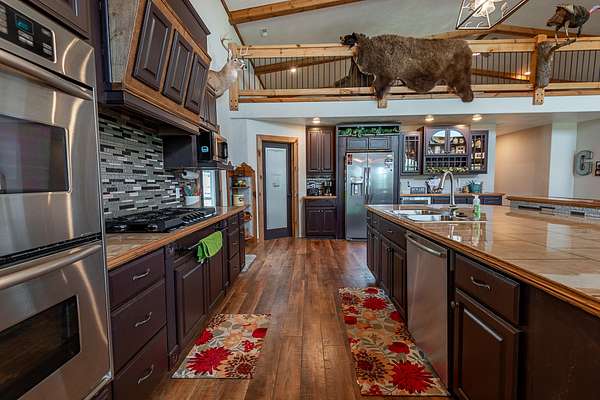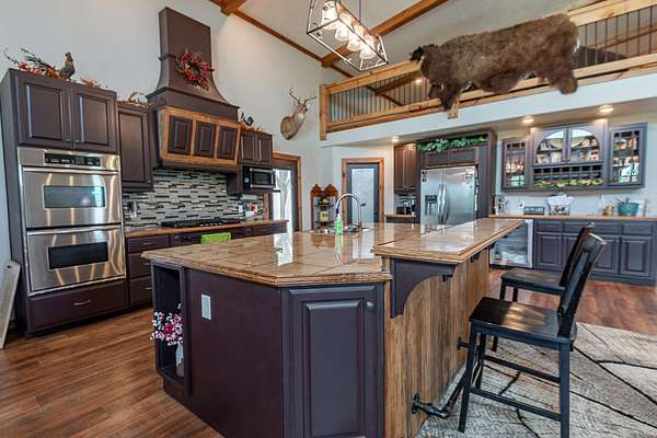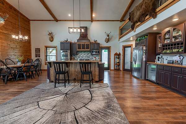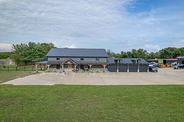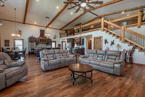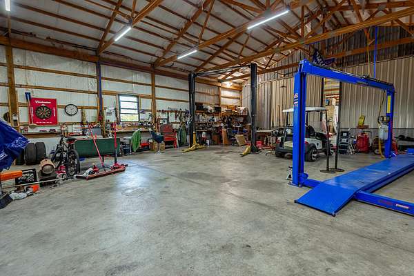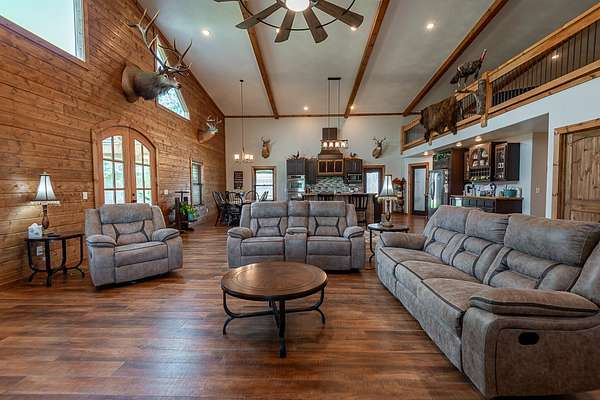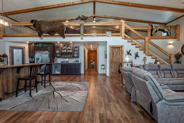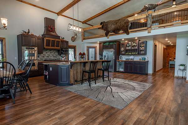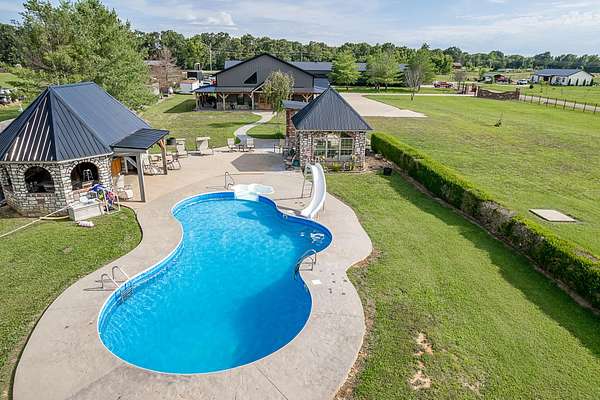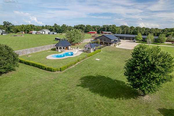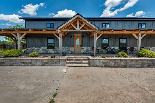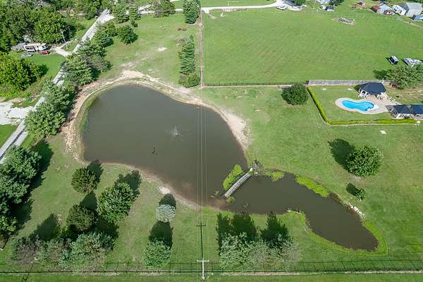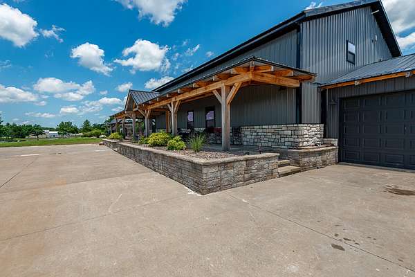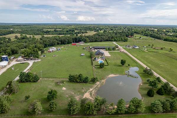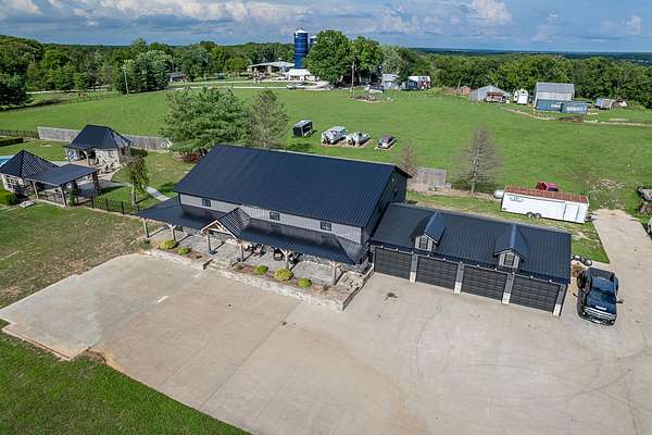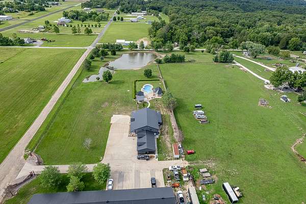 One of a kind newly builit home on acreage with a huge shop, 9 separate garage spaces, a stocked pond, a pool and even access to an airstrip! Located on a prime 7.1 acre tract just off Hwy W in Ozark and just south of the Gimlin Airstrip, this amazing property welcomes you with down it's private drive with a statue of an elk normally only seen at Bass Pro. The entrance is gated and beyond that is a huge expanse of concrete drive leading to the home and shop. The house was built in 2024 and features over 4000 sq.ft. of rustic charm including an enormous great room with open kitchen and dining room, a loft family room, 4 bedrooms, and 4 baths. The construction of this home includes foam insulation, a high effeciency heat and ac system, and an overbuilt structure that will stand the Ozarks weather with no issue. Other features include solid surface flooring, stainless appliances, granite and tile countertops, and a 4 car attached garage. The shop is south of the house and is 42x180 feet with a 1080 sq.ft. apartment located inside. There are 4 separate garage doors on the north side and the hanger door on the west side of the shop. The apartment has one bed and bath with a finished space upstairs as well. It is perfect for that in-law or teen needing some space. The shop is metal with concrete floors, 220 power, and room to run a business out of or keep your collection of toys. The acreage open with a wrap-around wrought iron fence around the entire perimeter for security and privacy. The inground pool and gazebo are perfect for hot summer days with the family or friends and the kids can go fish the fully stocked pond. It is very deep and has a wood arch bridge making access across the pond easy. 5 Minutes from Ozark and 10 minutes from Hwy 65 with easy access to Branson or Springfield. Ozark schools. One of the most unique and adaptable homes you will ever find in the Ozarks!