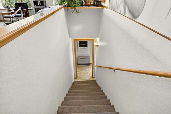 Welcome home to this custom-built, move-in ready retreat! The vaulted living room is complete with a free-standing woodburning stove and perfectly placed windows to let in an abundance of natural light. The dining area is conveniently located next to the kitchen with slider access to the oversized deck with retractable awning, overlooking the lush backyard and seasonal creek. The open kitchen has a gas range/oven, plenty of counterspace and storage, plus a skylight. The vaulted main level primary suite offers dual closets, dual sinks, tiled walk-in shower and an adjoining office. Downstairs you'll find pine ceiling detail in the 4th bedroom & bonus living space with outdoor access. Interior laundry leads to the two-car garage. Mature landscaping surrounds the property including fenced raised garden beds. Detached shed for extra storage. New roof recently installed + reinstalled solar panels.