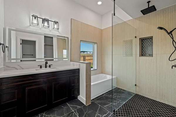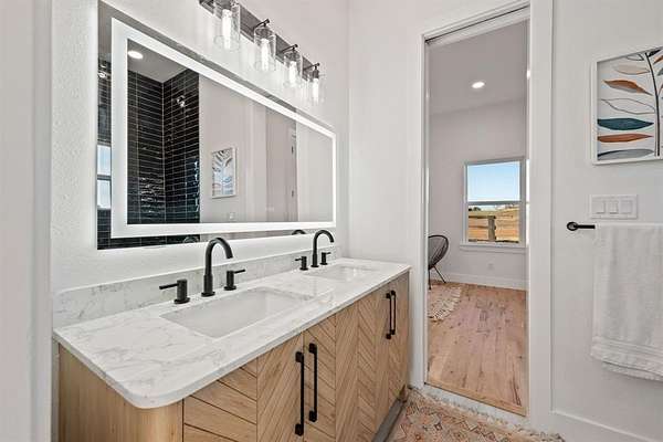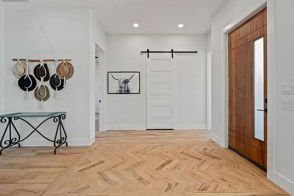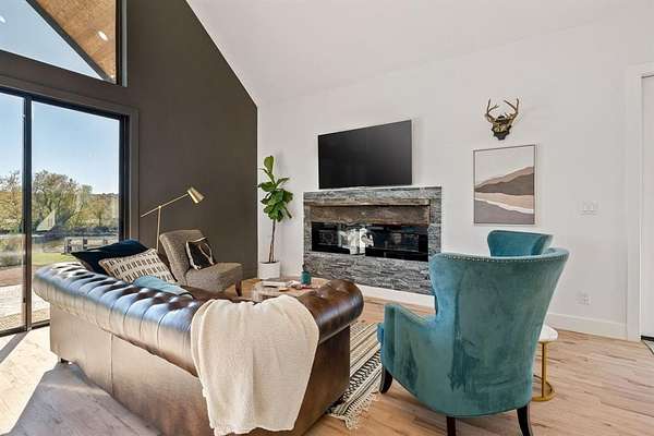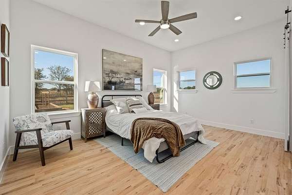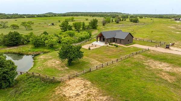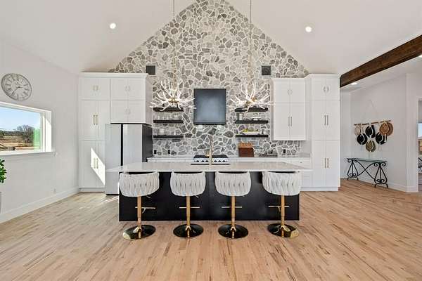 Texas modern is in! This extraordinary 11-acre ranchette in Desdemona, TX, perfectly embodies the trend with its blend of sleek design and rustic charm. Modern Americana finishes throughout give this property unmatched character and warmth. The 1,900-square-foot luxury home features three spacious bedrooms, two and a half baths, and an open-concept layout with soaring vaulted ceilings. Red oak wood floors flow throughout exuding elegance, while the electric fireplace adds a cozy focal point to the living area.