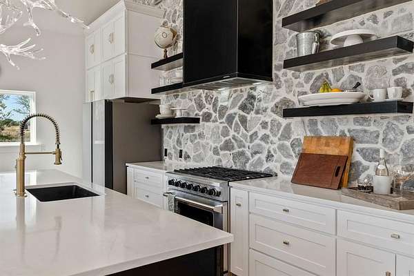 The heart of the home is the chef-inspired kitchen, anchored by a show-stopping Tennessee Crab Orchard mosaic rock feature wall and equipped with a high-end gas stove. Step outside to an entertainer's dream with an outdoor gas fire pit, perfect for hosting under the Texas stars. The property also includes thoughtfully landscaped grounds with an irrigation system, raised garden beds, and a picturesque pond.