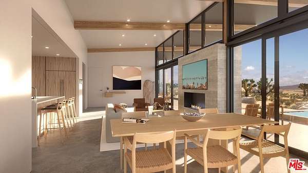 Pre-sale opportunity with an expected completion of Spring 2026. Experience the perfect blend of modern luxury and desert serenity just minutes from the breathtaking landscapes of Joshua Tree National Park. This stunning new home with a detached ADU sits on 2.27 expansive acres, offering uninterrupted panoramic views of the peaceful surroundings, including head-on views of Goat Mountain. The property features a 1,442 sq. ft. main residence with three bedrooms and three bathrooms, designed for seamless indoor-outdoor living. Soaring 16-foot ceilings and floor-to-ceiling glass walls create an airy, open atmosphere that brings the beauty of the desert inside. The sleek chef's kitchen boasts premium oak cabinetry and Caesarstone countertops, offering both style and functionality. A 690 sq. ft. detached ADU provides additional living space, perfect for guests, a home office, or an income-generating rental. A breezeway carport elegantly connects the two structures, offering shaded parking and architectural cohesion. Step outside and unwind in your private oasis, complete with a sparkling pool, a soothing spa, and a cozy fire pit, perfect for stargazing and peaceful desert nights. Located close to La Copine, Pappy & Harriet's, and top off-road adventure spots, including Sand to Snow National Monument and King of the Hammers, this home offers a prime location for both relaxation and recreation. Don't miss this exclusive pre-sale opportunity to own a one-of-a-kind desert retreat. This property also qualifies for Opportunity Zone benefits.