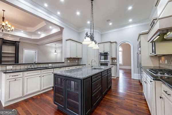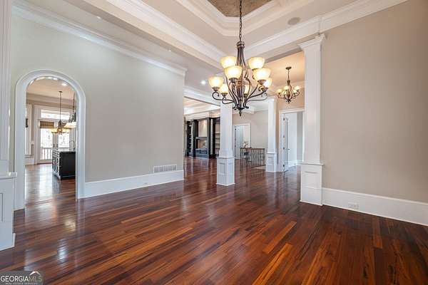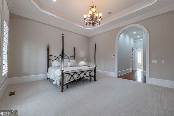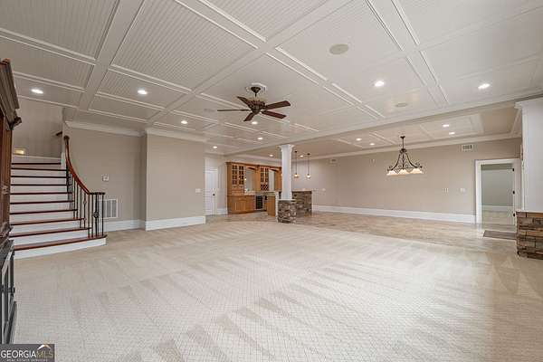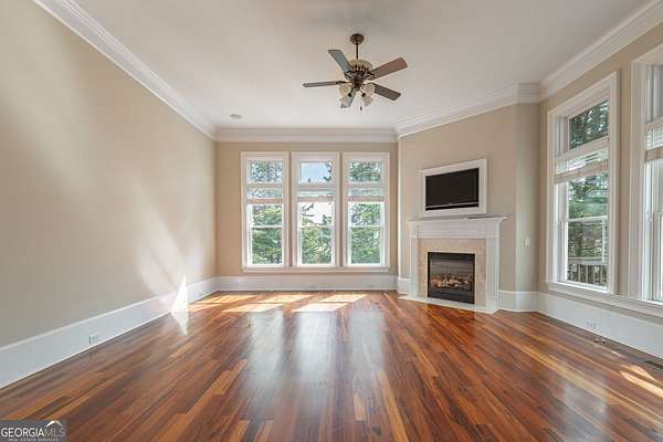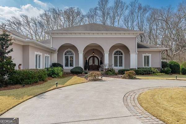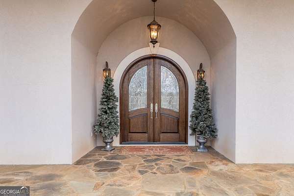Welcome to your dream home! Nestled behind private gates on 5 serene acres with classic corral-style fencing, this stunning Mediterranean-style estate offers luxury, privacy, and exceptional functionality just minutes from Downtown Dawsonville and GA 400. A wraparound driveway creates a grand approach, highlighted by an elegant stacked-stone tiered fountain centerpiece. Step inside to a grand foyer that sets the tone for the home, leading to a private office with glass French doors and an elegant formal dining room with a coffered ceiling that comfortably accommodates seating for twelve. The main living areas feature soaring 15-foot ceilings and rich Brazilian hardwood floors throughout. The gourmet kitchen, complete with a Sub-Zero-style refrigerator, overlooks the expansive great room-creating an ideal space for both everyday living and entertaining. A separate sitting room with a fireplace offers a warm and inviting place to relax. The main-level primary suite serves as a private retreat, featuring direct access to the rear deck, a spa-inspired bathroom, and two oversized California-style walk-in closets. Two additional ensuite bedrooms are also located on the main level, providing comfort and privacy for family or guests. A Generac whole-house generator provides added peace of mind. The oversized three-car attached garage connects seamlessly to a fully functional mudroom and laundry room for everyday convenience. A large rear deck spans the length of the home and includes dedicated grilling and sitting areas for effortless outdoor living. Designed for entertaining, the walk-out terrace level features high ceilings, a full bar/kitchen, pool room, massive recreation and great room areas, and a spacious ensuite bedroom. Additional spaces include an exercise room, large office (or potential additional bedroom), utility room, second laundry room, low-voltage media center, and an expansive workshop. Step outside to enjoy the flagstone sitting area and fire pit-perfect for evenings under the stars. Equestrian enthusiasts will appreciate the separate, fully functioning three-stall horse barn complete with tack room and corral area. The property's corral-style fencing and open layout create an ideal setting for horses while maintaining the beauty and privacy of the estate. A rare opportunity to own a private estate that blends refined living, equestrian amenities, and everyday convenience in one exceptional property.