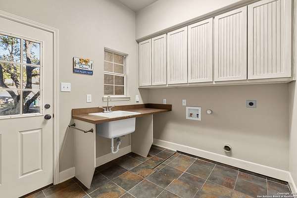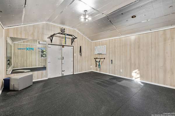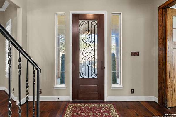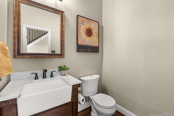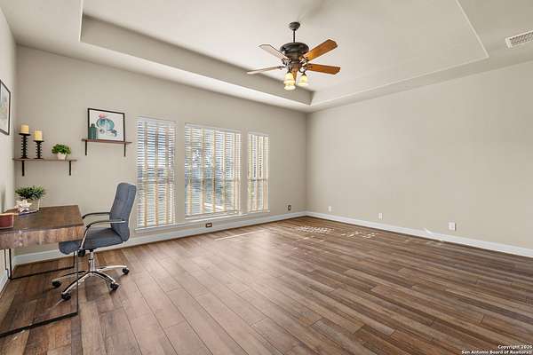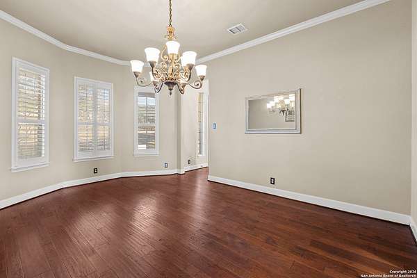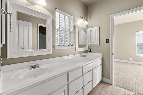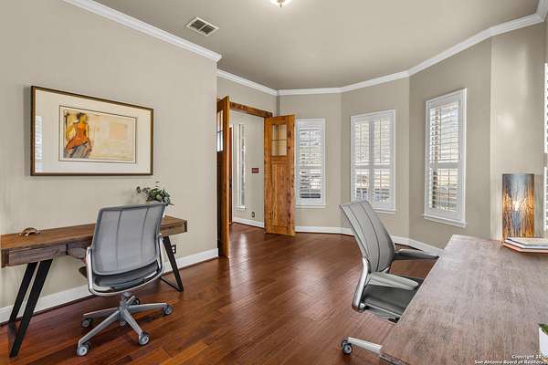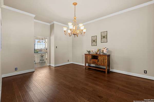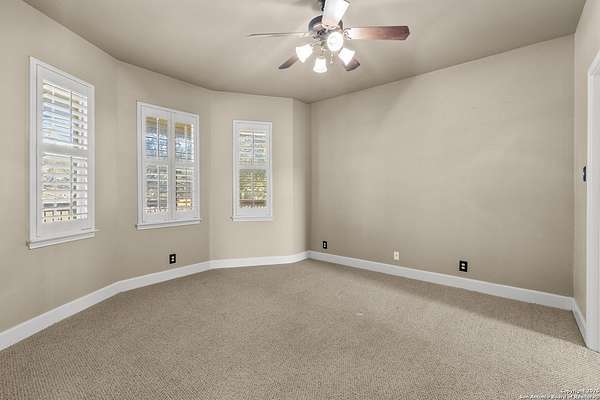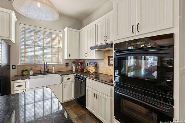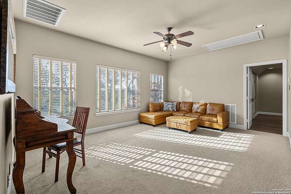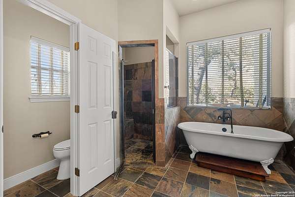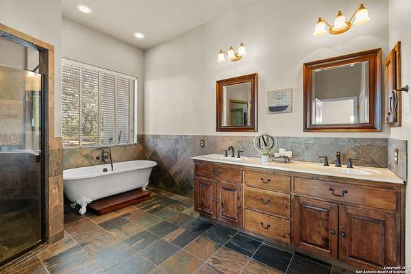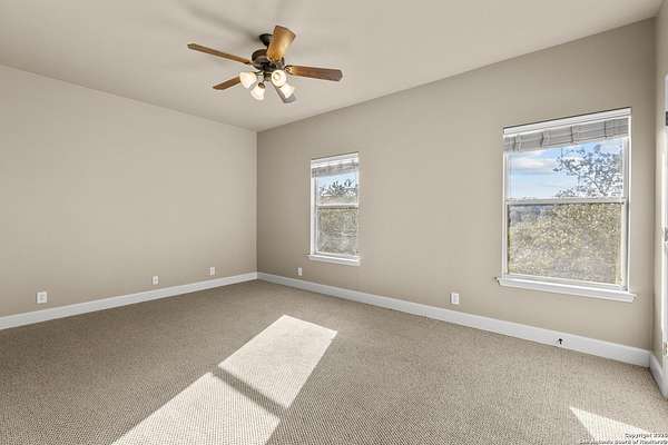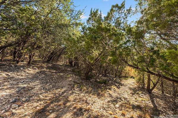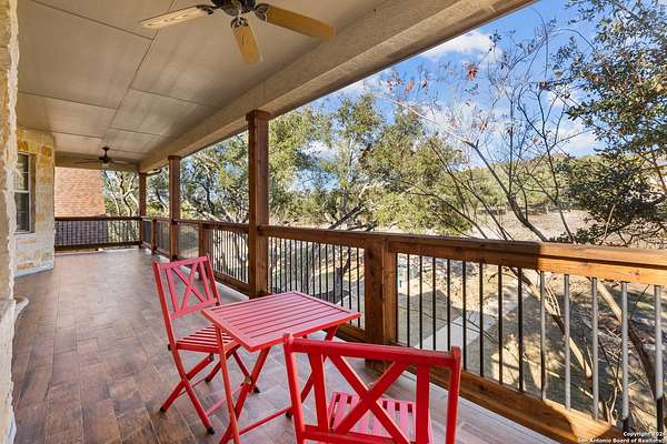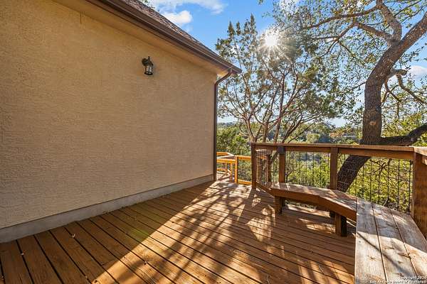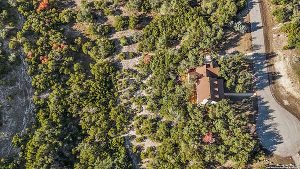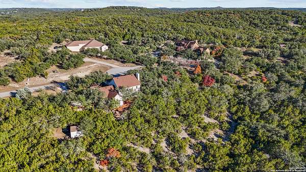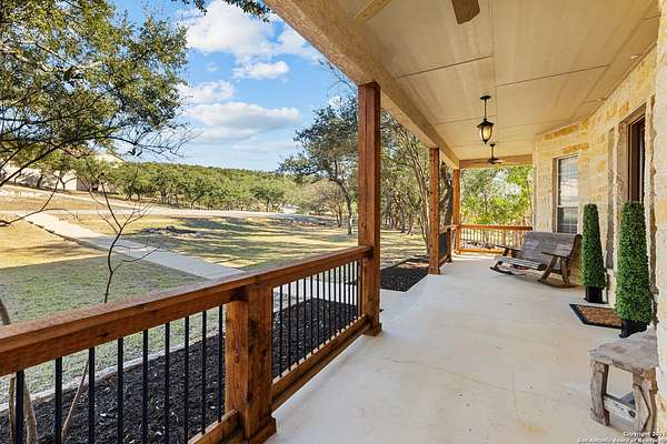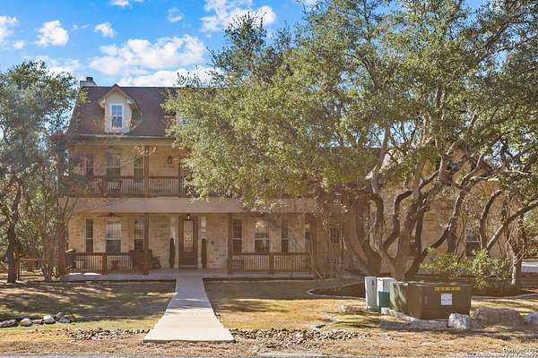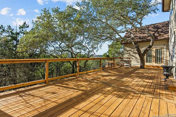 Welcome to your private oasis, a beautifully wooded hilltop setting in the Texas Hill Country. Take in incredible sunset views atop your expansive deck. This home is on a cul-de-sac inside River Crossing with almost 3 acres to explore! Roam scenic trails, connect with the wildlife in the backyard, or stretch out in the front yard for relaxation or safe outdoor play. Want to watch the sun rise? You can do that too on your front covered patios, both on the first and second floors. Island kitchen, granite counters, double ovens & custom cabinetry. Wood floors downstairs, shutters on all front windows, primary bedroom down w/ outside access, clawfoot tub in the primary bathroom with a separate shower. Two staircases give you easy access to upstairs, one side is bedrooms and the other is flex, media, game space. Large downstairs study with barn doors. Kitchen is open to a large family room with fireplace and lots of natural light. Need a home gym, workshop or extra storage? It's here and ready to serve your needs. The roof is newly installed as are gutters. Enjoy peaceful walks right in your own back yard. River Crossing is also a golf community and also offers access to a private River Park on the Guadalupe. Fantastic location to getaway from the hustle and bustle, but conveniently located in a neighborhood close to 281 and 46, HEB, Home Depot, Wal-Mart, restaurants and nestled between New Braunfels and Boerne with a peaceful drive to the wine country. Make this your oasis!