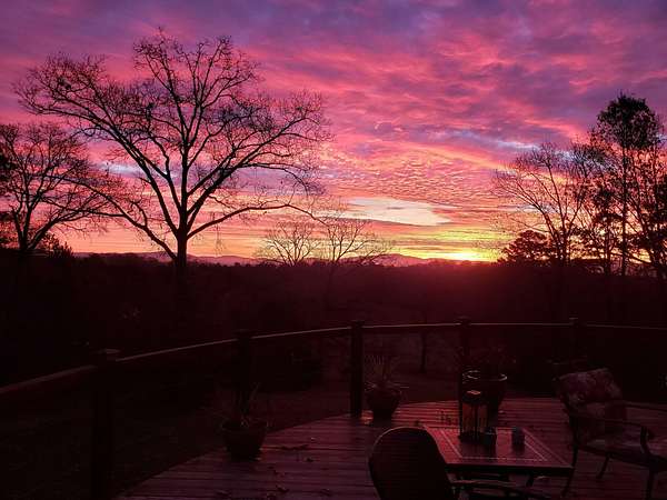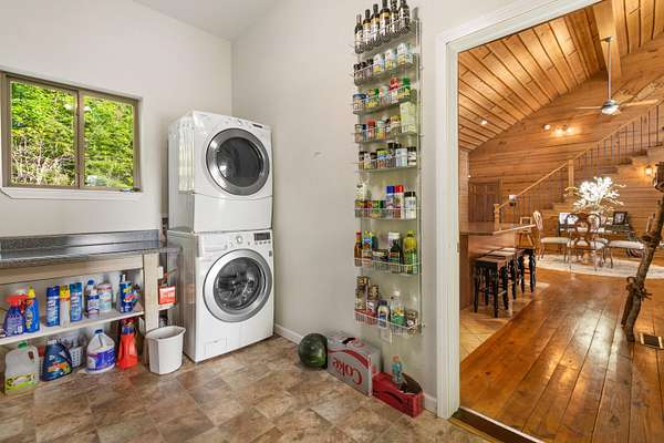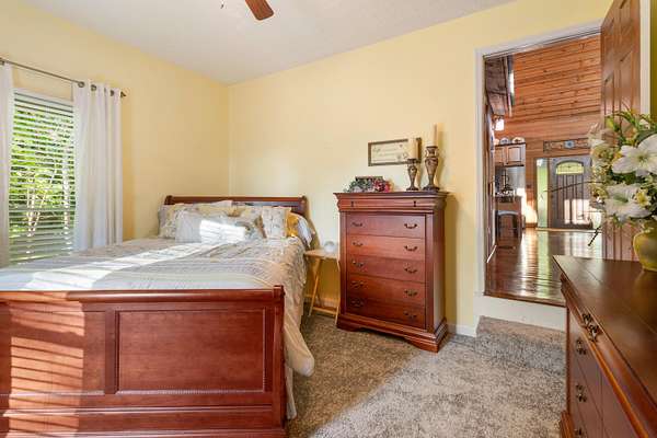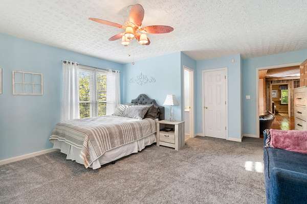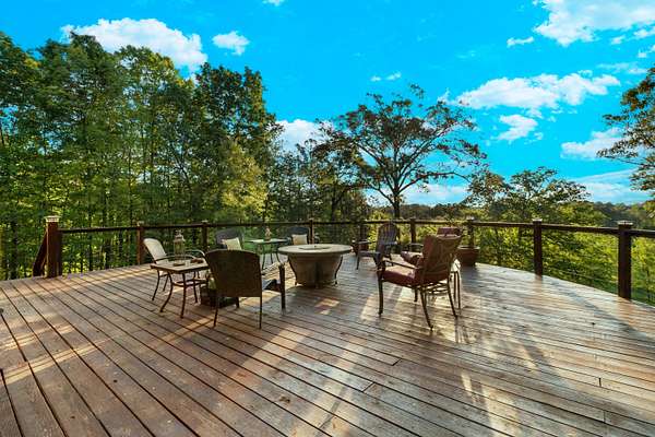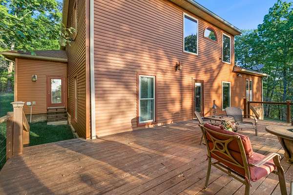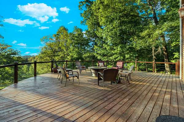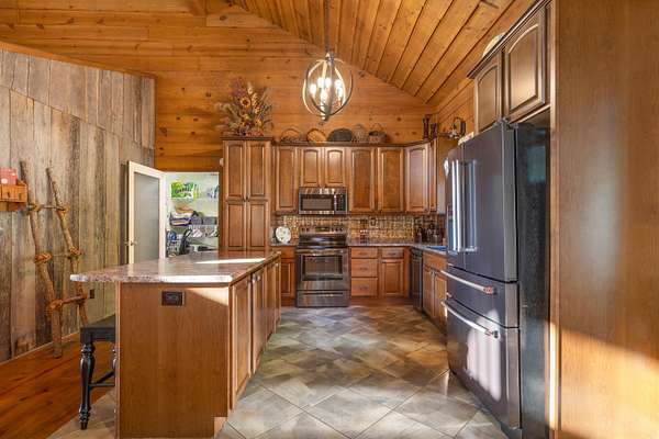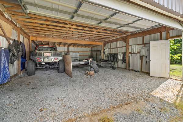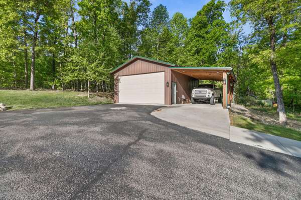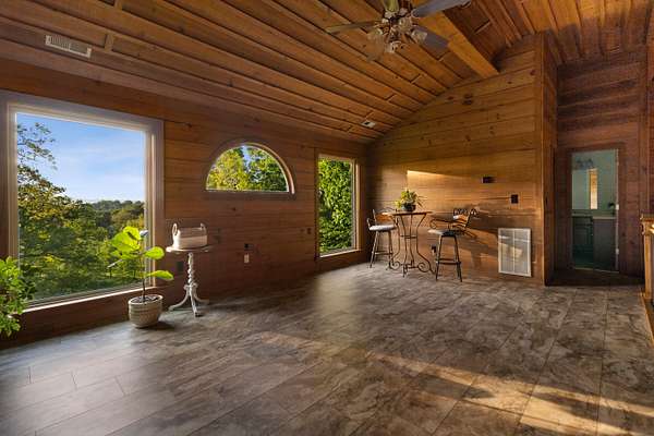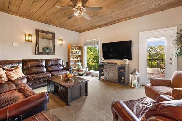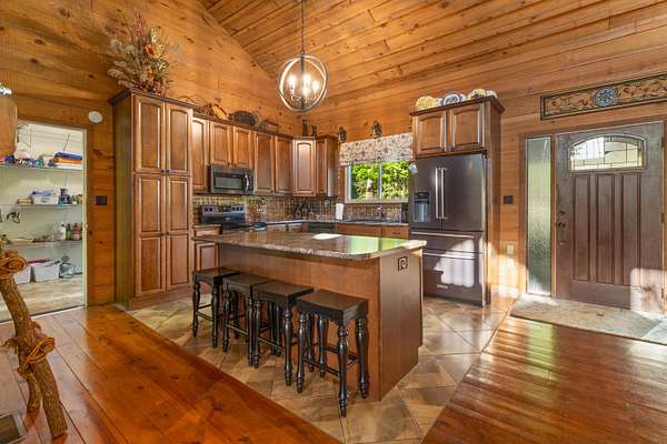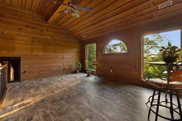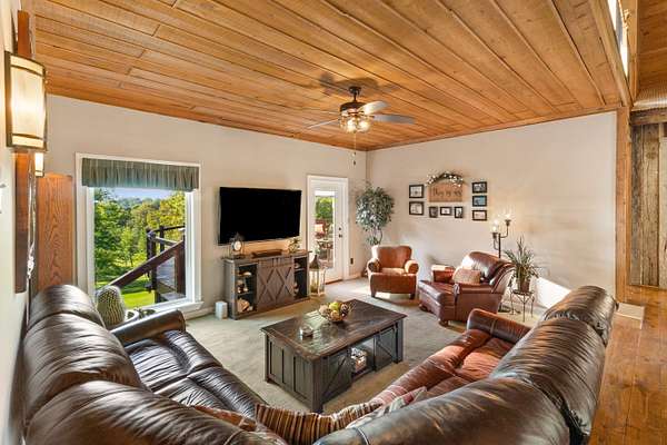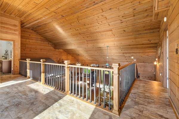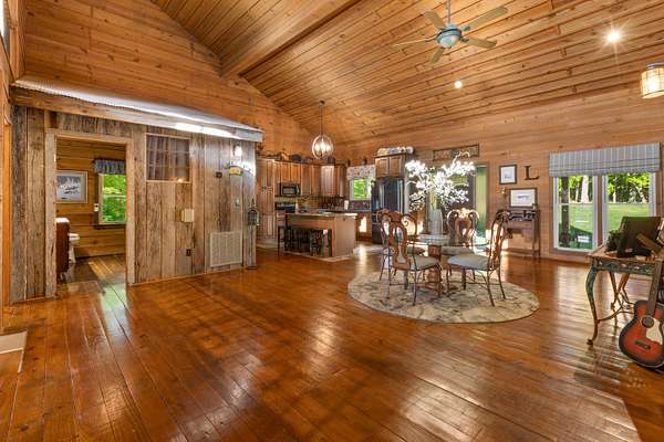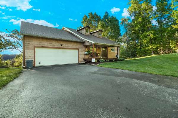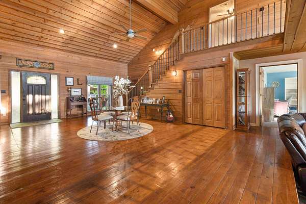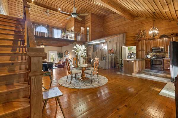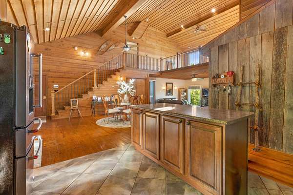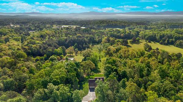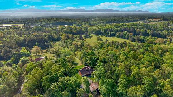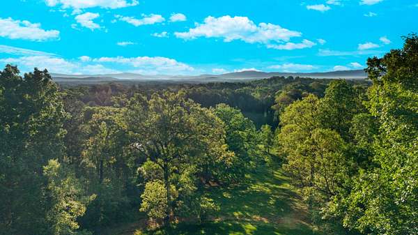 Contemporary cabin-style home on a stunning 7.3-acres property with spectacular mountain views. This private setting is surrounded by mature hardwoods and offers plenty of space for horses, recreation, or simply enjoying the outdoors. The home features two large main-level bedrooms, including one with an en-suite bath, plus a second full bathroom. A huge loft-style bonus room upstairs includes a full bath and large walk-in spacious kitchen, living room, and den overlooking the beautiful fields, along with a large walk-in pantry/laundry room for exceptional storage. Outdoor living is a highlight with multiple porches perfect for relaxing and taking in the view. The property includes a large, attached garage, two extra-large detached garages ideal for vehicles, equipment, or toys and a storm shelter equipped with utilities and sized for several people. The grounds feature lush, irrigated grass and mature trees that enhance the privacy and natural beauty of this truly magical property.
