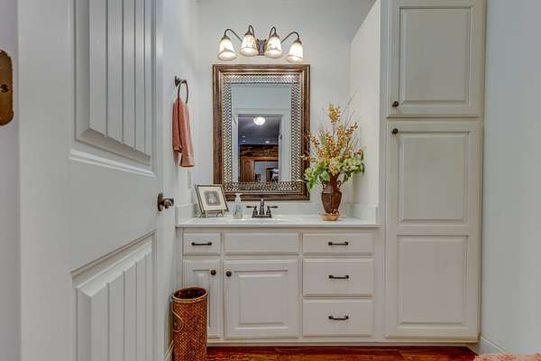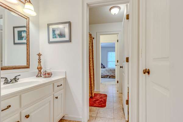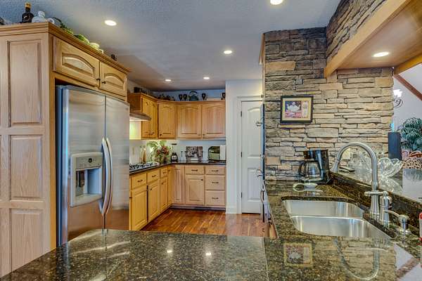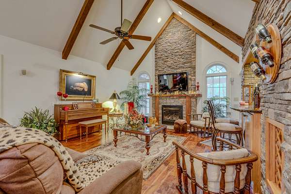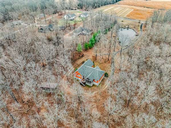 Country and cozy or enticing and elegant. You be the judge; either way enjoy the beauty of this home as you drive onto the property to be greeted by the pond out front and the home that is nestled among trees in this country setting. Enter the beautiful foyer into the living room and dining room with high vaulted ceilings with beams. Watch the beauty of those rooms come alive with the beautiful gas stone fireplace and the stone surrounding the walls that lead into the kitchen and breakfast nook. On one end of the house 2 bedrooms share a bathroom where each bedroom has its own vanity cabinet. From one of the bedrooms you can step out onto the screened in porch. On the other end of the house you will find a gorgeous master suite that boasts of a sitting area and large master bathroom. Bath includes shower, separate tub, and 2 separate vanities. Beautiful kitchen with eat in breakfast nook that has a door that leads to the screened in porch and deck area. Home also offers a nice powder room and large utility area. Upstairs is a large bonus room with additional storage space. Home includes a 2 car attached garage, additional storage under the house and a large travel trailer carport.