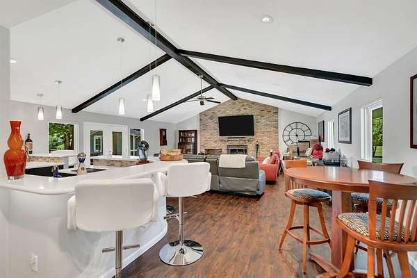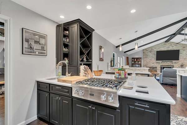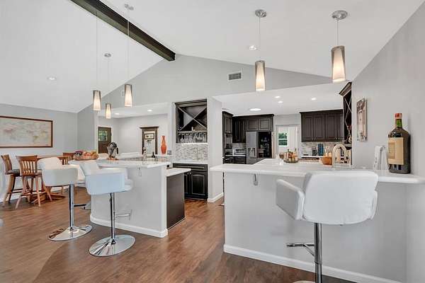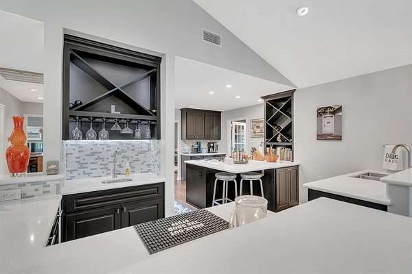 - Built-In Features, Built-In Wine Cooler, Decorative Lighting, Double Vanity, Kitchen Island, Open Floorplan, Pantry, Vaulted Ceiling(s), Wet Bar