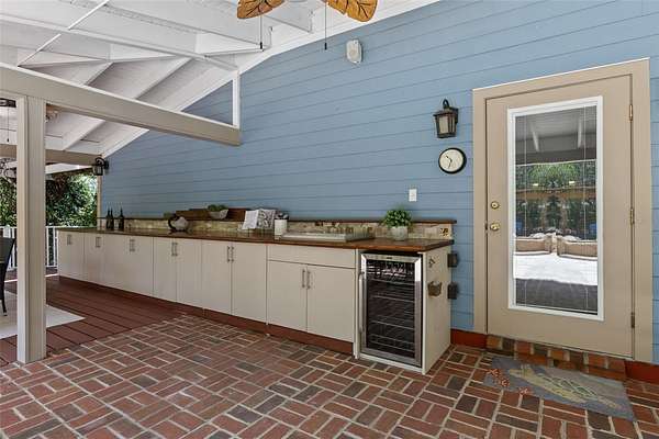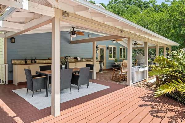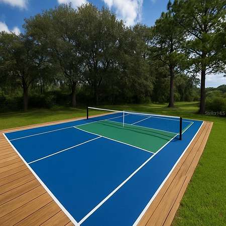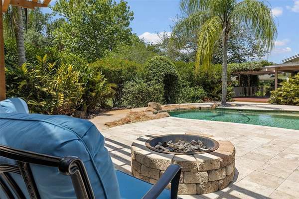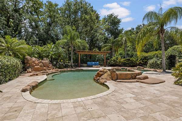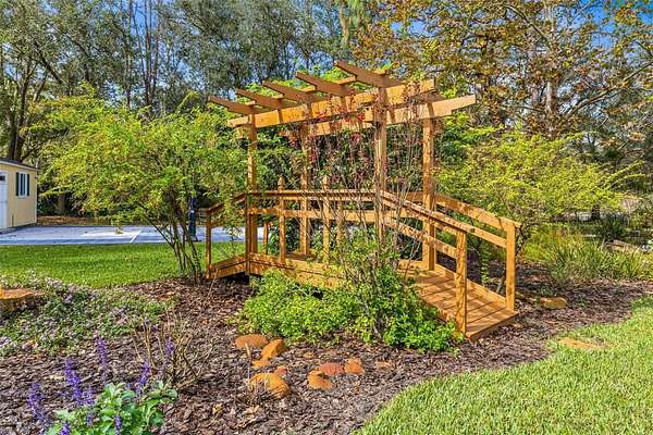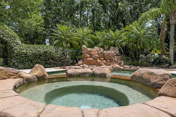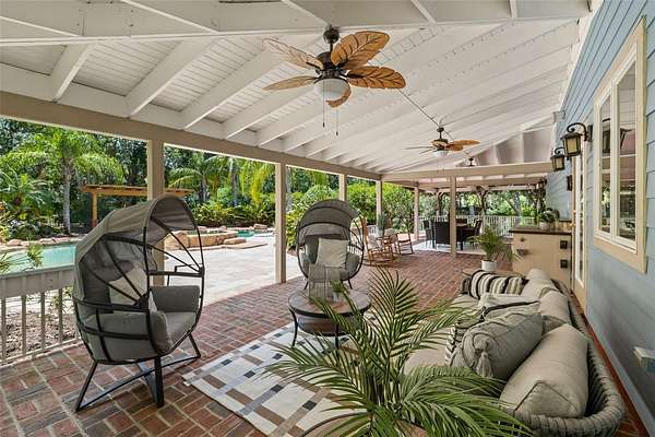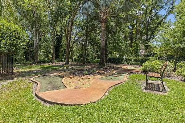 Outdoors, this property transforms into a tropical escape. The highlight is the ZERO ENTRY POOL AND SPA with rock waterfall features, surrounded by lush landscaping that creates a private oasis. An expansive covered rear porch provides a shaded space for entertaining, outdoor dining, or simply relaxing. The property also includes a MINI GOLF COURSE for practicing your putts, a basketball court for recreation, and a detached 12'x28' STORAGE SHED with electricity, for extra convenience.
