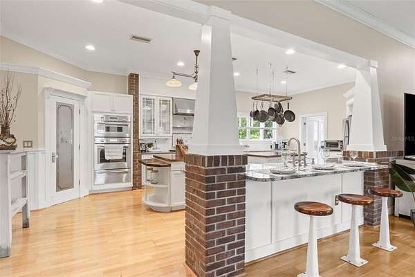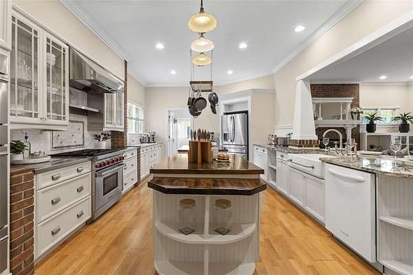 To your left, the SOLID OAK WOOD FLOORS lead to a formal dining room, ideal for hosting dinners, while to your right, a cozy living room features a charming brick WOOD-BURNING FIREPLACE that invites relaxation. The living room flows into a chef's dream kitchen, fully equipped with top-of-the-line appliances. It includes a premium WOLF GAS RANGE, double built-in ovens, two spacious islands, a pantry, and abundant cabinet and counter space with a FARMHOUSE SINK. The kitchen also offers a breakfast bar, ideal for casual dining or socializing while cooking. The mix of countertop materials provides something for every use, the islands feature a trendy butcher block, the sink counters are premium granite and near the stove you'll find a stainless steel work surface.