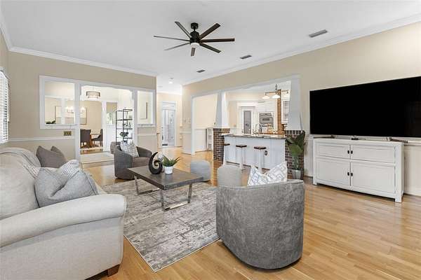 - Built-In Features, Ceiling Fans(s), Crown Molding, Eat-In Kitchen, Kitchen/Family Room Combo, Primary Bedroom Main Floor, Solid Wood Cabinets, Walk-In Closet(s)
