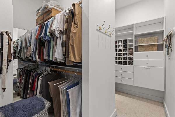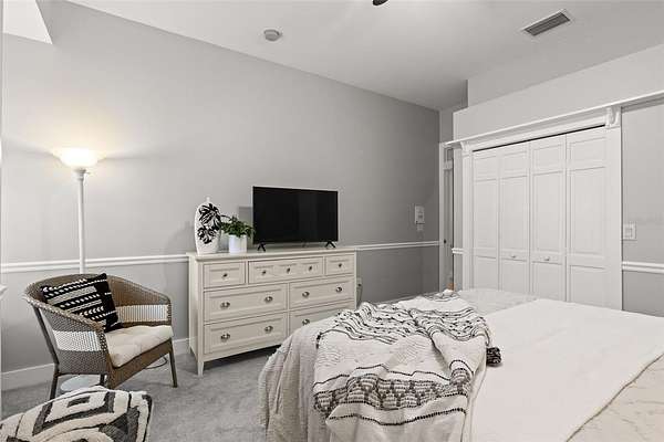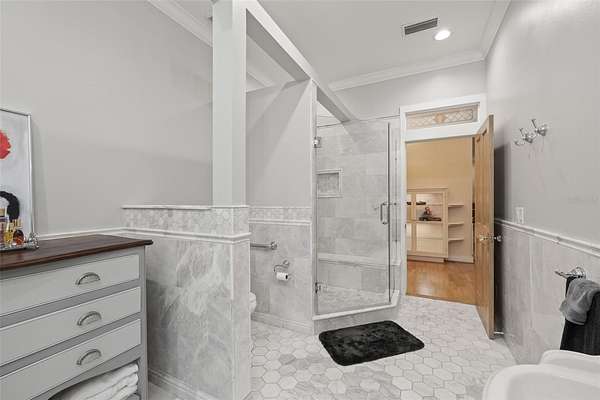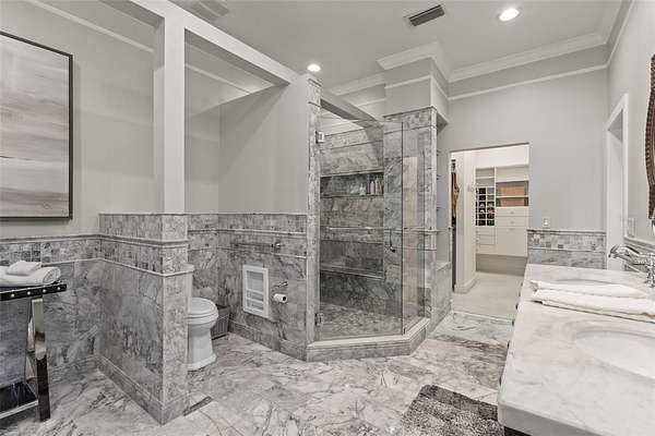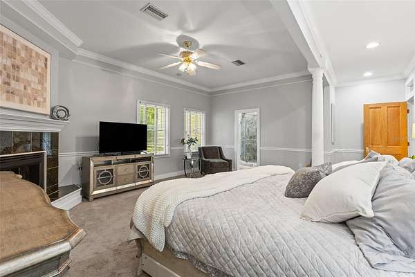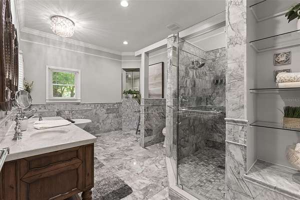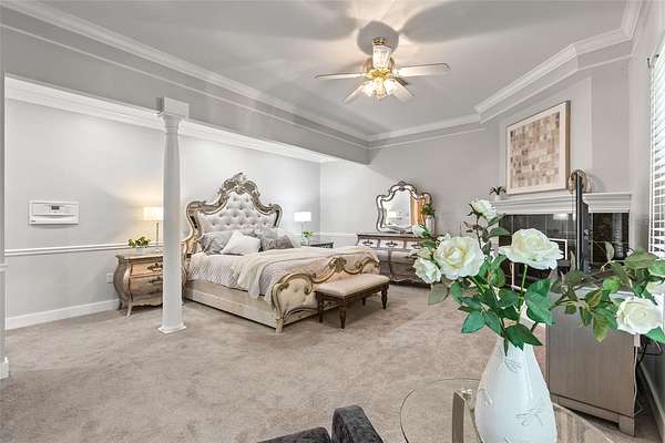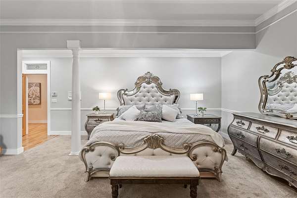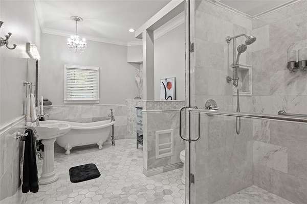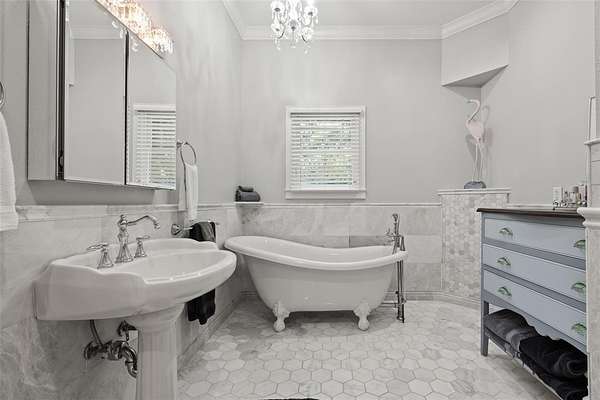 The master suite is a true retreat, featuring an elegant fireplace, a spacious walk-in closet with custom built-ins, and a luxurious ensuite bathroom. This spa-inspired bathroom includes MARBLE flooring, a CLAWFOOT TUB beneath a chandelier, double vanities, and a walk-in shower, combining sophistication and comfort. Two additional large bedrooms are well-appointed with plush carpeting and share a second full bath with a clawfoot tub, a chandelier light and a spacious WALK-IN SHOWER all adorned in marble tile.