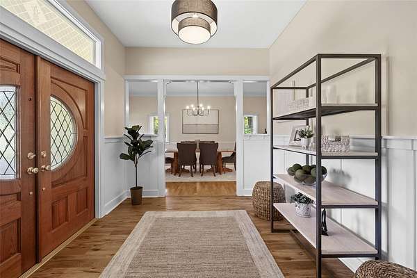 A beautiful covered front porch with French doors welcoming you into the foyer, where classic elegance meets modern comfort.