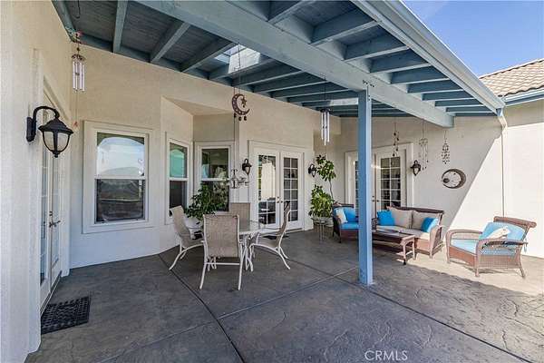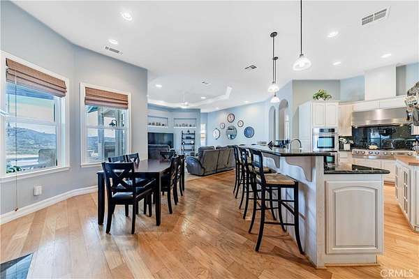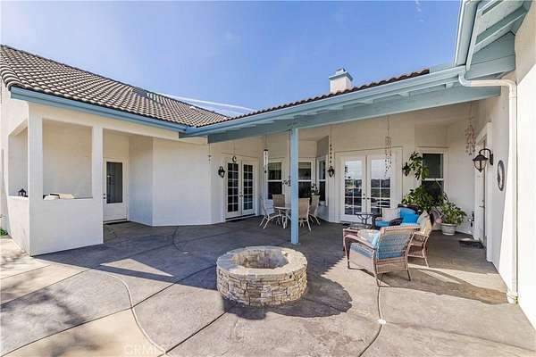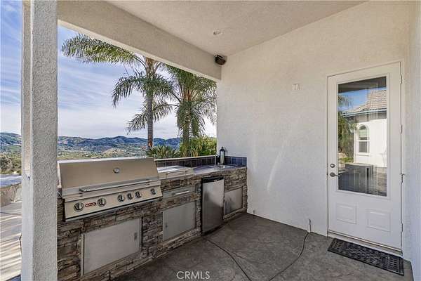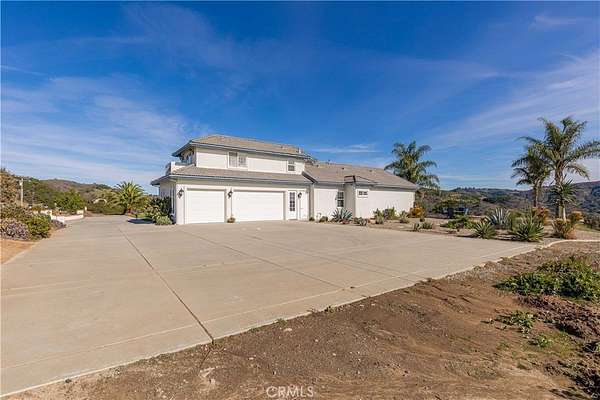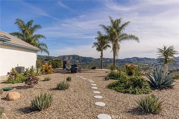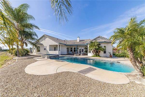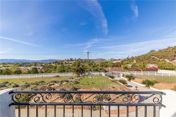 Welcome to 25025 Las Palmeras Drive, a commanding Mediterranean estate perched atop nearly five acres within the unmatched De Luz community of Temecula. From the moment you pass through the dual-gated entry and travel up the long, palm-lined driveway, this property delivers an extraordinary sense of arrival. Perfectly positioned on a hilltop with panoramic views of rolling hills, lush groves, and the entire De Luz valley, this home offers unmatched privacy, incredible scale, and the ultimate Southern California lifestyle. Built with timeless craftsmanship and meticulously maintained, the residence spans 4,275 sq. ft. and features soaring 11-12 foot coffered ceilings, extensive crown molding, solid oak flooring, and natural light flooding in from every angle. The grand foyer opens to formal living spaces anchored by a two-sided fireplace, French doors, and expansive windows framing the breathtaking views. The chef's kitchen is both elegant and functional, offering granite countertops, custom white oak cabinetry, high-end appliances, a pot filler, double ovens, two islands, a veggie sink, and abundant storage--perfect for both everyday living and large-scale entertaining. All bedrooms are located on the main level, each oversized, ensuite, and beautifully appointed. The primary suite is a true retreat, complete with an enormous walk-in closet, luxurious soaking tub, spa-like shower, and private access to outdoor patios. Upstairs, a spectacular game room and wet bar serve as the ultimate entertainment space, complete with its own full bath and a balcony overlooking some of the most stunning vistas in all of Temecula. The outdoor living experience is resort caliber. A custom pool with spa and waterfall sits at the edge of the property, capturing sweeping hilltop views. The outdoor kitchen, fire pit, shaded lounge areas, and expansive patio space make this estate ideal for gatherings of any size. The grounds also feature low-maintenance landscaping, Birds of Paradise, manicured lawns, RV parking, space for 20+ vehicles, multiple flat pads ideal for an ADU or future development, and a charming walking path with a wooden bridge over a seasonal ravine. Located just minutes from Old Town Temecula, Wine Country, and the I-15, this home offers the best of privacy, convenience, and the coveted De Luz lifestyle. 25025 Las Palmeras Drive is a rare hilltop sanctuary offering space, elegance, and spectacular views in one unforgettable package.