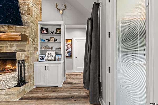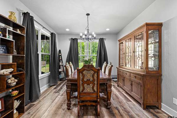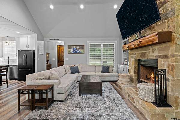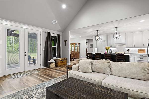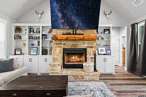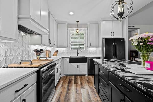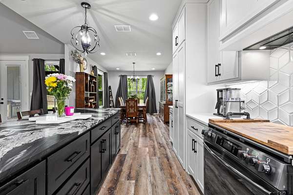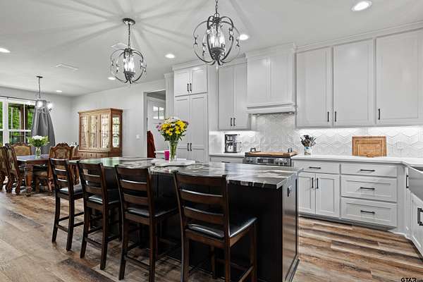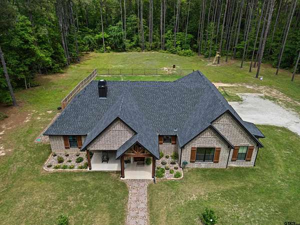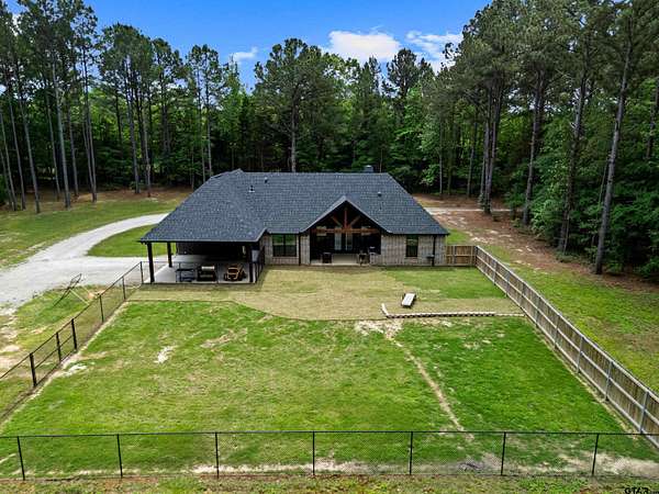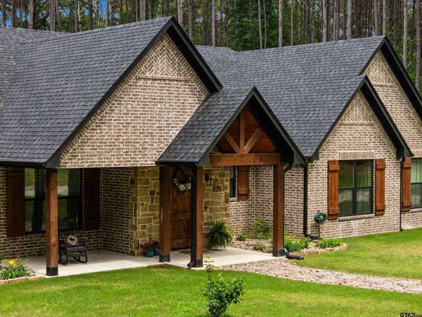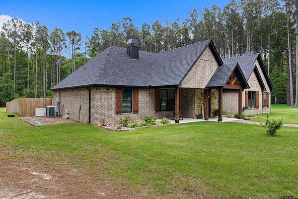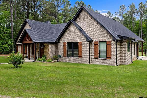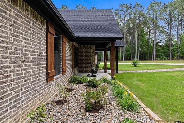 Built with intention and a sense of refinement, this custom brick home offers 3 bedrooms, 2 bathrooms, and a split layout that gives the primary suite a true sense of privacy. The open living, dining, and kitchen spaces flow effortlessly, creating a home that feels both elevated and easy to live in. The kitchen is understated yet striking, with quartz countertops, ceiling height shaker cabinetry, soft under cabinet lighting, and a leathered granite island designed for gathering. A black farmhouse sink, gas range, and black stainless appliances complete the space, while a hidden butler’s pantry keeps everything beautifully tucked away. In the living room, vaulted ceilings and a Douglas fir beam bring warmth and scale. A floor to ceiling stone fireplace anchors the space, designed for wood burning with a gas start and the option for gas logs. Built ins add a clean, finished look, and French doors open to the covered back patio. The primary suite is set apart, offering a retreat with dual sinks, quartz countertops, a walk in shower with rain head, and a soaking tub set beneath a chandelier. The walk in closet is thoughtfully designed with built ins and generous storage. On the opposite side of the home, two spacious guest bedrooms with walk in closets share a well appointed bath with tile flooring, quartz counters, and a tiled tub and shower combination. Outside, the covered patio mirrors the home’s design with vaulted tongue and groove ceilings, exposed beams, and an outdoor kitchen with leathered granite, sink, mini fridge, and Blackstone griddle, overlooking a fenced backyard with recently sodded Bermuda and a wooded backdrop that adds both privacy and a relaxing setting. Additional features include an oversized two car carport, utility room, whole home Generac generator, and a tankless gas water heater. A home that feels considered, timeless, and elevated.