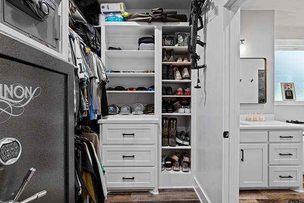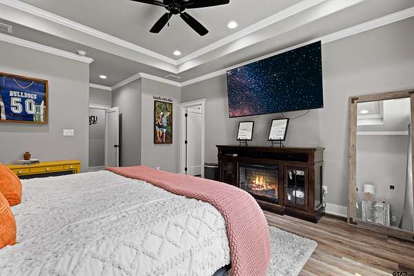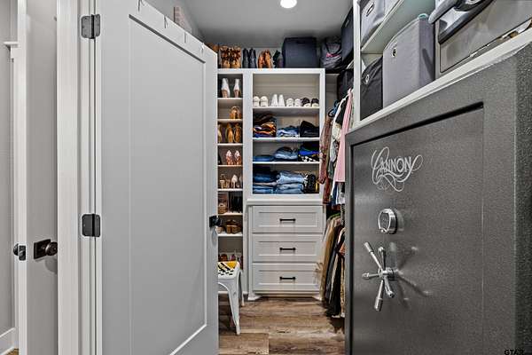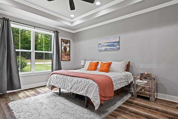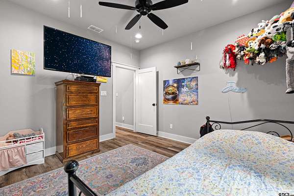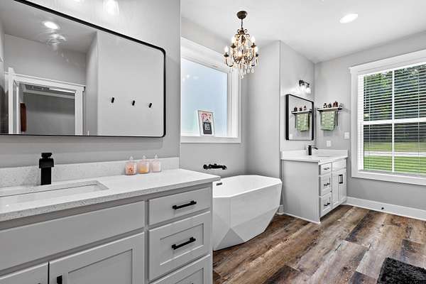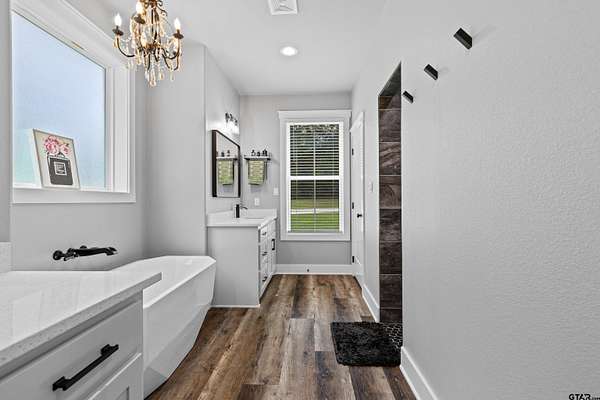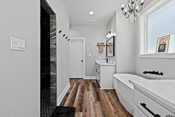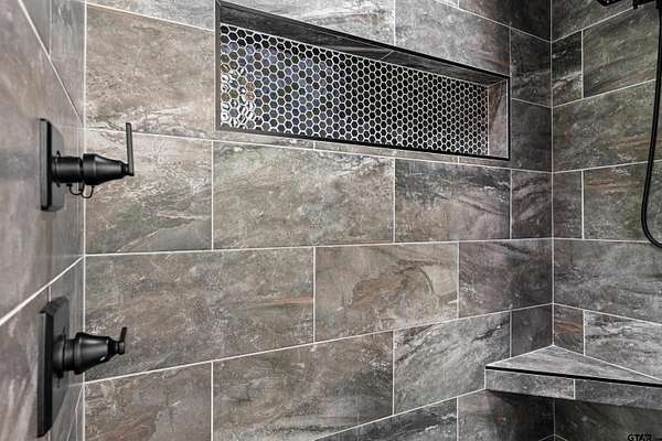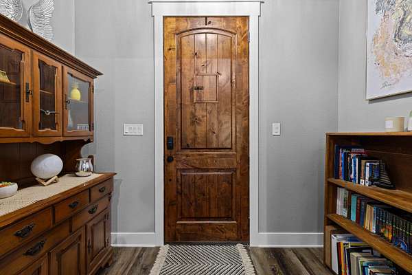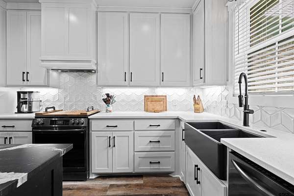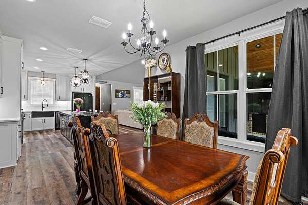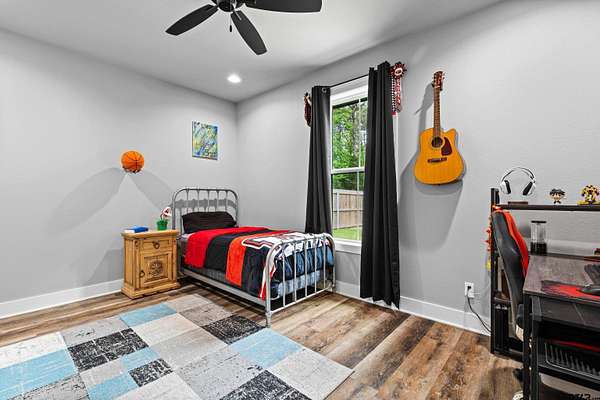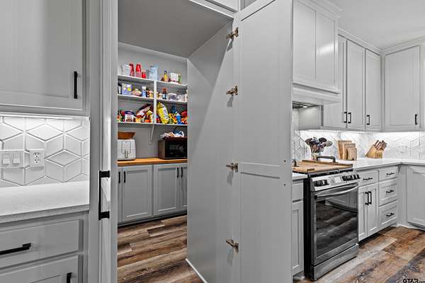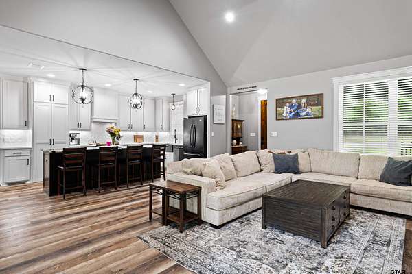 Built with intention and a sense of refinement, this custom brick home offers 3 bedrooms, 2 bathrooms, and a split layout that gives the primary suite a true sense of privacy. The open living, dining, and kitchen spaces flow effortlessly, creating a home that feels both elevated and easy to live in. The kitchen is understated yet striking, with quartz countertops, ceiling height shaker cabinetry, soft under cabinet lighting, and a leathered granite island designed for gathering. A black farmhouse sink, gas range, and black stainless appliances complete the space, while a hidden butler’s pantry keeps everything beautifully tucked away. In the living room, vaulted ceilings and a Douglas fir beam bring warmth and scale. A floor to ceiling stone fireplace anchors the space, designed for wood burning with a gas start and the option for gas logs. Built ins add a clean, finished look, and French doors open to the covered back patio. The primary suite is set apart, offering a retreat with dual sinks, quartz countertops, a walk in shower with rain head, and a soaking tub set beneath a chandelier. The walk in closet is thoughtfully designed with built ins and generous storage. On the opposite side of the home, two spacious guest bedrooms with walk in closets share a well appointed bath with tile flooring, quartz counters, and a tiled tub and shower combination. Outside, the covered patio mirrors the home’s design with vaulted tongue and groove ceilings, exposed beams, and an outdoor kitchen with leathered granite, sink, mini fridge, and Blackstone griddle, overlooking a fenced backyard with recently sodded Bermuda and a wooded backdrop that adds both privacy and a relaxing setting. Additional features include an oversized two car carport, utility room, whole home Generac generator, and a tankless gas water heater. A home that feels considered, timeless, and elevated.