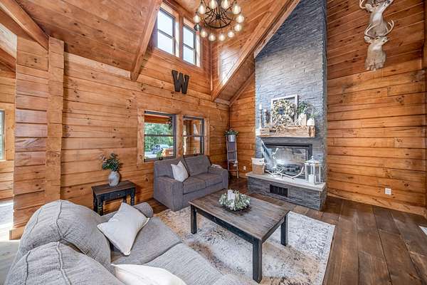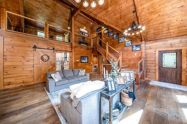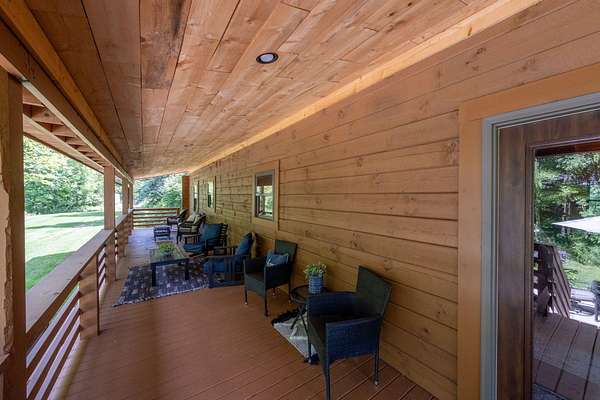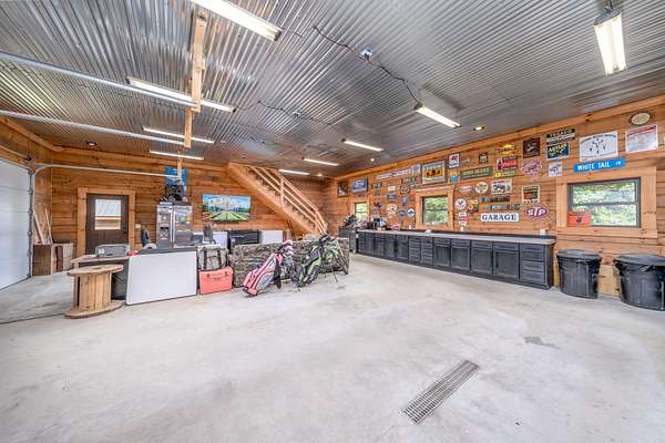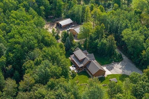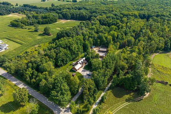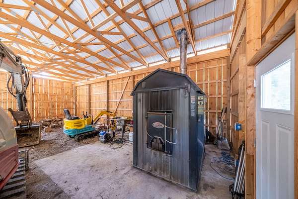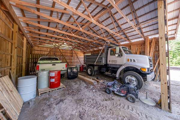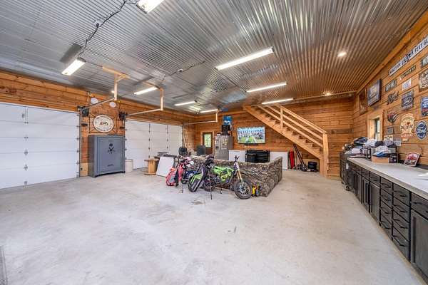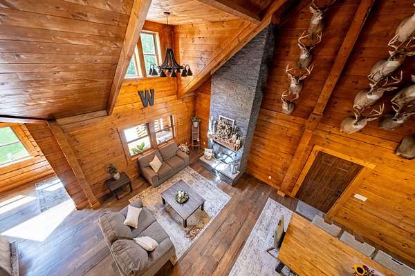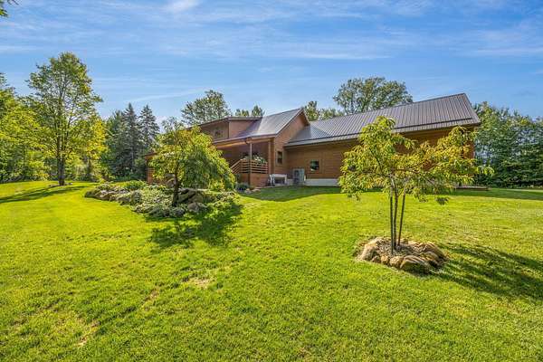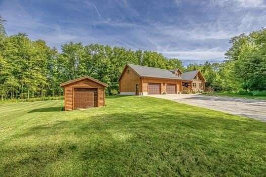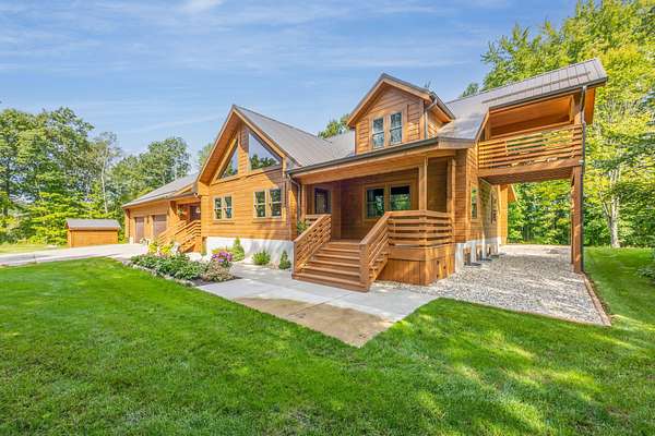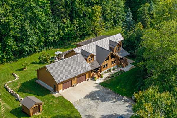 Welcome to this custom-built log home on 10 wooded acres, offering over 4,500 sq ft of finished living space. This four-bedroom, three-and-a-half-bath retreat blends rustic charm with modern luxury. A soaring 20-ft vaulted ceiling with dramatic high accent windows and a wall of woodland-view picture windows fill the home with natural light. The open living area showcases custom woodwork and a stunning stone fireplace. The gourmet kitchen features sleek cabinetry, concrete countertops, and a large peninsula with seating, and Samsung smart appliances. The spacious primary suite offers heated floors, a spa-like walk-in shower with dual shower heads, and a private balcony-perfect for peaceful coffee mornings. Radiant in-floor heating runs throughout the entire home-including the heated and cooled four-car garage. The home is also equipped with modern smart technology, including multi-zone smart thermostats that allow you to control the climate on every level, plus high-speed internet for seamless connectivity. Downstairs, the finished lower level extends the living space with a cozy family room, rustic shiplap walls, stylish metal ceilings, and a Pinterest-worthy laundry room. Upstairs, an extra-large, mostly finished bonus room above the garage offers flexible options for a gym, office, playroom, or guest suite. Outdoors, over 800 sq ft of covered porches wrap the home, creating ideal spaces for entertaining, relaxing with family, or simply taking in the wooded scenery. The 10 wooded acres also offer excellent deer hunting right out your back door. A 30x40 pole barn provides ample room for a 40-foot camper, pontoon, and more. A second barn houses a Classic outdoor wood boiler with storage for a year's worth of firewood and equipment. For those interested in homesteading, a ready-to-go chicken coop is included. Multiple hydrants and an underground sprinkler system make caring for the landscaped grounds simple and efficient. Comes with a year's worth of logs for wood boiler. Every detail of this home has been thoughtfully designed to combine comfort, function, and rural charm. With radiant in-floor heating throughout, expansive outdoor living spaces, and 10 wooded acres of privacy, this Lakeview retreat is modern comfort and country freedom wrapped in one unforgettable package.