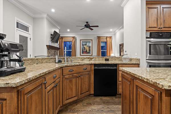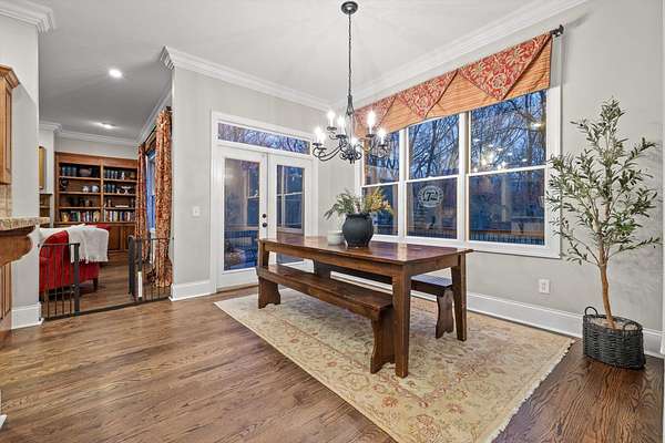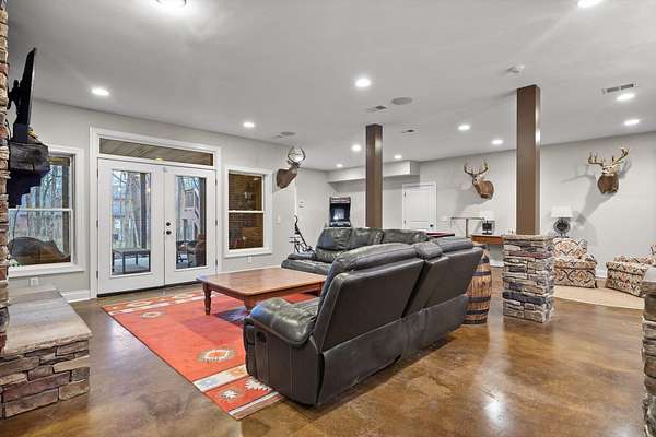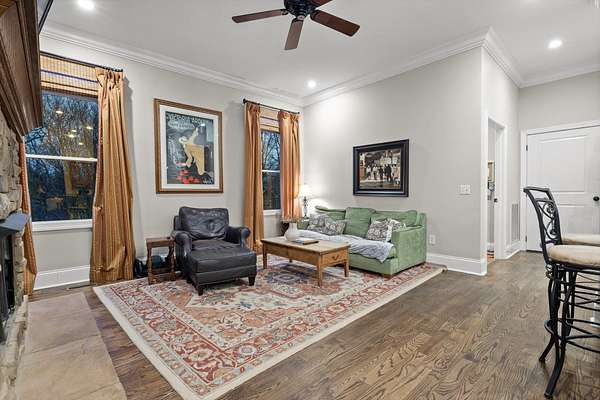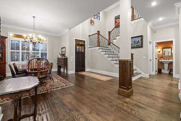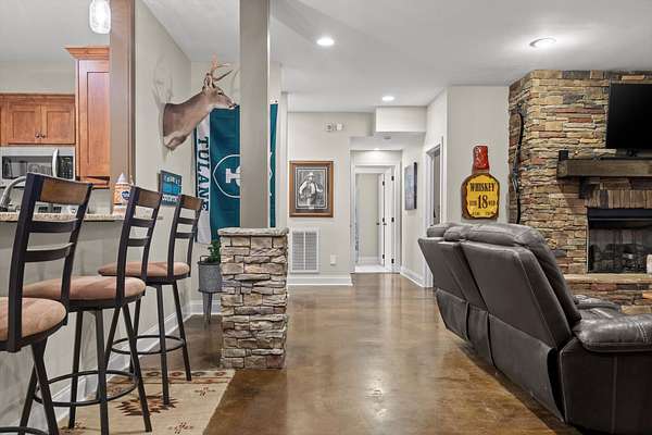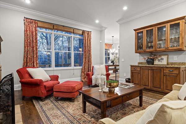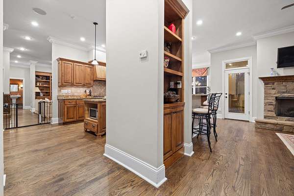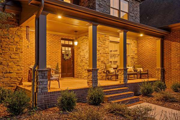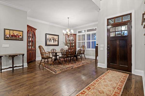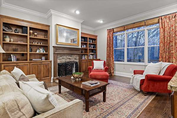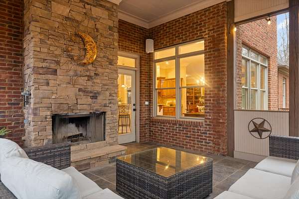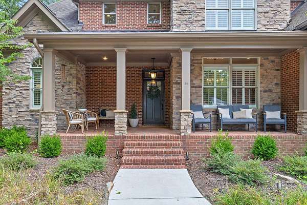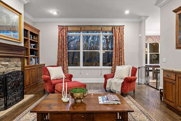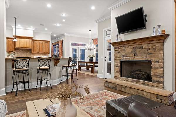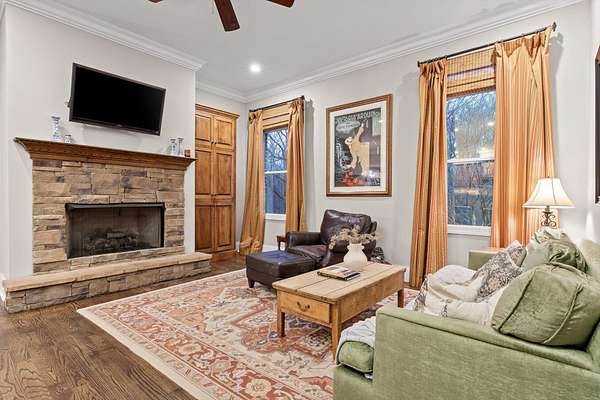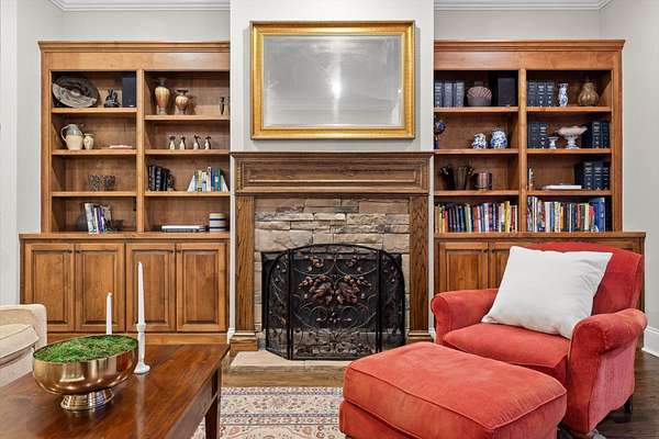 A charming covered front porch invites you inside, where a formal dining room sits to your right and the living area opens ahead, anchored by a stone fireplace with custom built-ins and additional cabinetry, perfect for display or a stylish bar. Soaring ceilings and abundant natural light create a warm and inviting atmosphere.