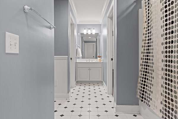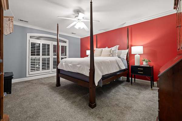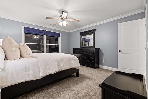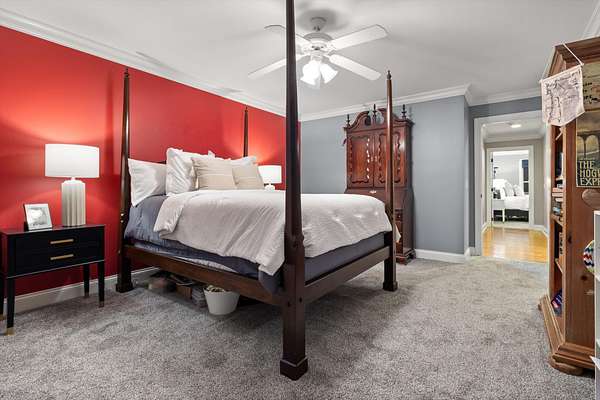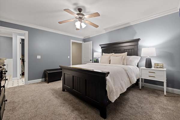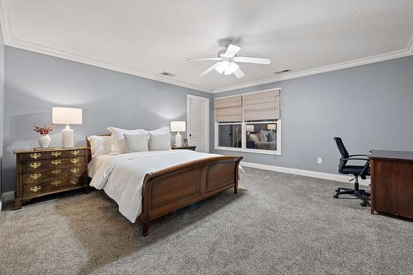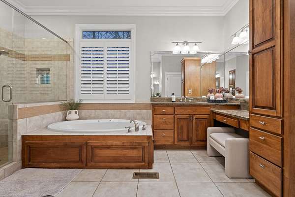 The primary suite, privately located on the opposite side of the home, offers a serene retreat with a spa-inspired bath, jetted soaking tub, and separate tiled shower.