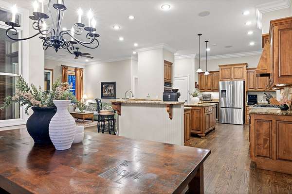 The kitchen is the heart of the home, featuring an oversized island, stainless steel appliances, abundant cabinetry, and a bright breakfast nook. Just off the kitchen, a cozy keeping room with its own fireplace provides a relaxed spot for evenings or casual entertaining. A convenient main-level laundry room and a guest half bath add practicality to everyday living.