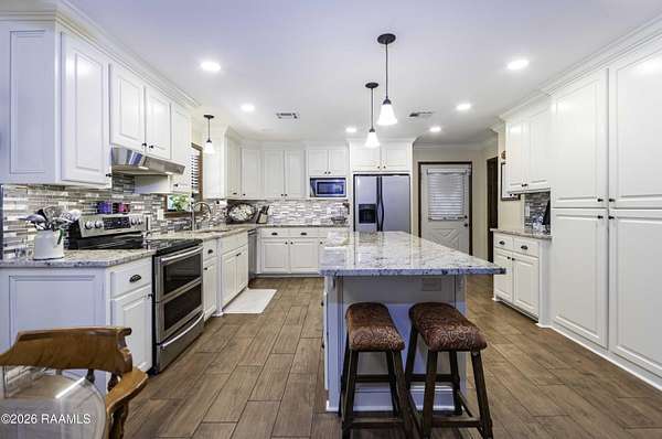 Charming Riverfront Estate on just under 6 acres. Nestled on a picturesque 5.89-acre property, this 4-bedroom, 3 bath home offers a perfect blend of comfort and natural beauty. A stately oak-lined driveway welcomes you to this private retreat, surrounded by a serene pecan tree grove and boasting 500 feet of Bayou Teche River frontage-ideal for peaceful mornings or outdoor adventures. Inside the home features and updated kitchen with granite counters, stainless appliances and a breakfast area. You'll notice the ample storage in all of the cabinets and pantry. Off of the kitchen is a large formal dining area that is large enough for a table of 10 or 12. The spacious living area has a wet bar, tons of built-ins and a wood burning fireplace. The master suite has already been updated for you with a freestanding tub, tiled shower, and a granite double vanity and a large walk-in closet. The guest bedrooms are large and great closet space. The 4th bedroom would make a great office or craft room. The 2nd and 3rd bath have been updated with granite counters. Whether you're looking for a family home or a place to embrace the outdoors, this home has it all. Brand NEW Roof!