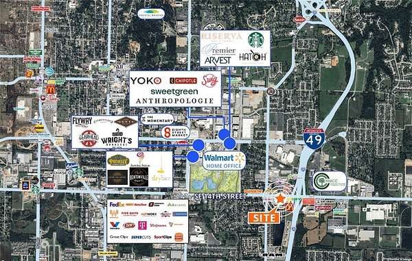 - Quick and easy access to I-49 - Located seconds from the new 350-acre Walmart Home Office campus - Approximately 31,000 vehicles per day on SE 14th Street and 61,000 vehicles per day on I-49 - Zoned: C-2