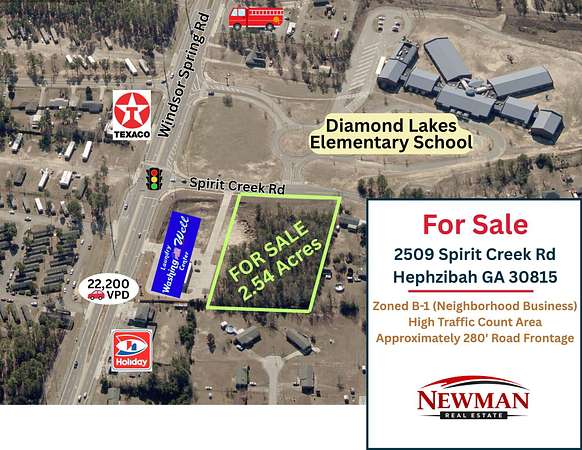 Newman Real Estate is proud to offer this beautiful 2.54 acre parcel well located in south Augusta just off highly traveled Windsor Spring Road. This lot offers all utilities and would be easy to develop into any commercial venture that fits into B-1 (neighborhood business) zoning. Fronting the property on Windsor Spring Road is a coin operated laundry. The property sits right across the street from Diamond Lakes Elementary School and might be ideal for a children's day care facility. Just a few hundred yards up Windsor Spring Road is the intersection with Tobacco Road, which is a very high visibility section of south Augusta. Fort Eisenhower/Gordon is only four miles away as is Augusta Regional Airport. With approximately 280' feet of frontage on Spirit Creek Drive the property offers excellent access. 2509 Spirit Creek Drive is just off Windsor Spring Road, directly across the street from Diamond Lakes Elementary School, in South Augusta. It is only one-half-mile from Tobacco Road and the Walmart Neighborhood Market and 4 miles from Fort Eisenhower. The area surrounding the property boasts a dynamic mixture of commercial and residential spaces, making it an ideal location for developers.