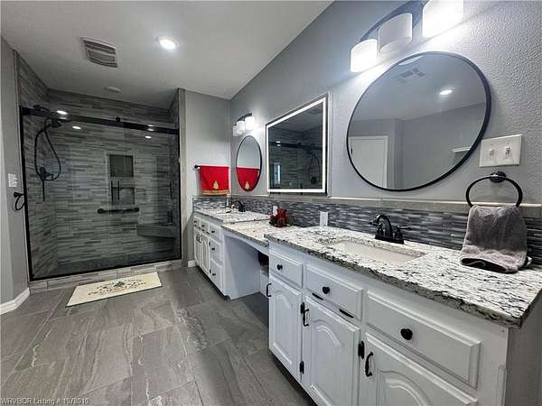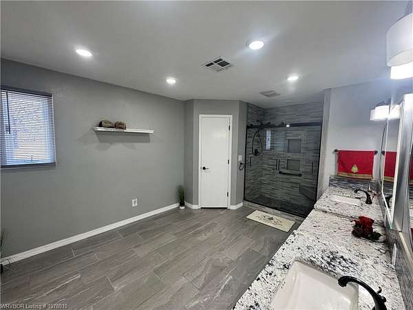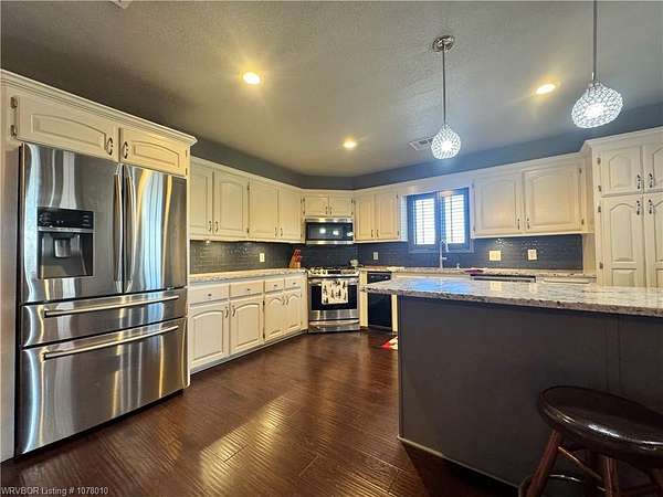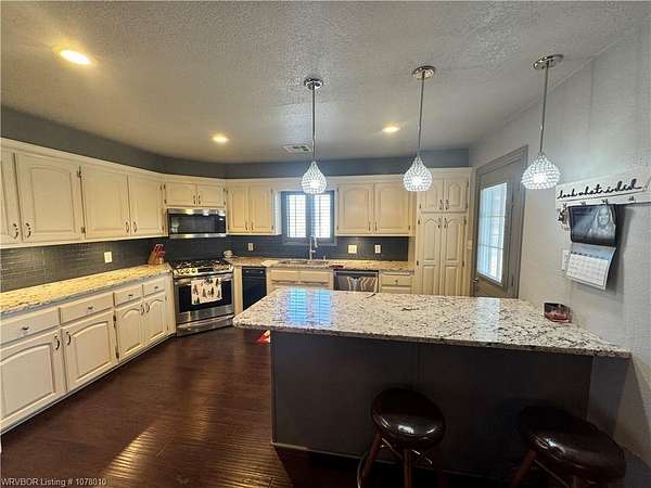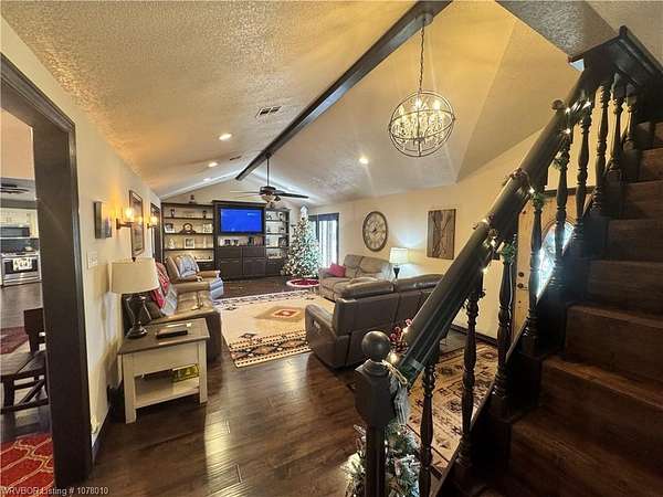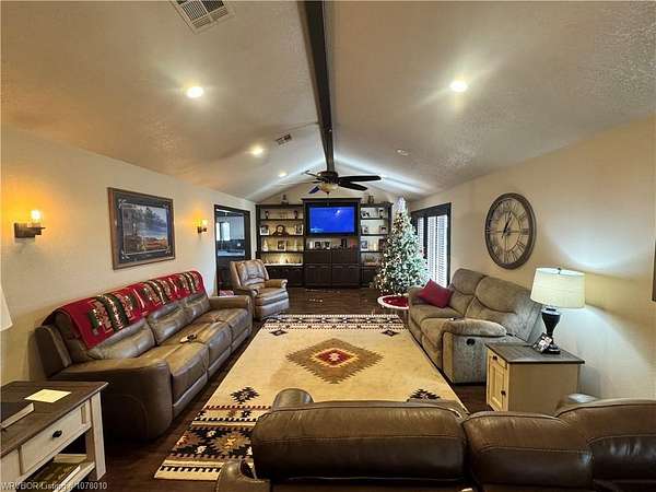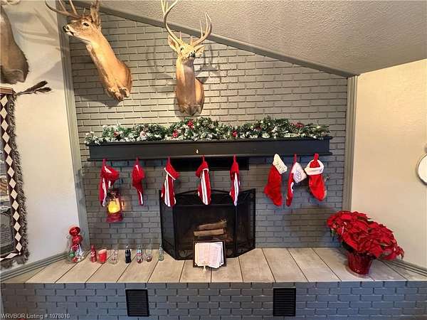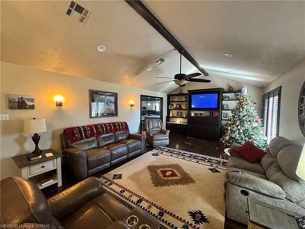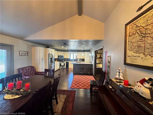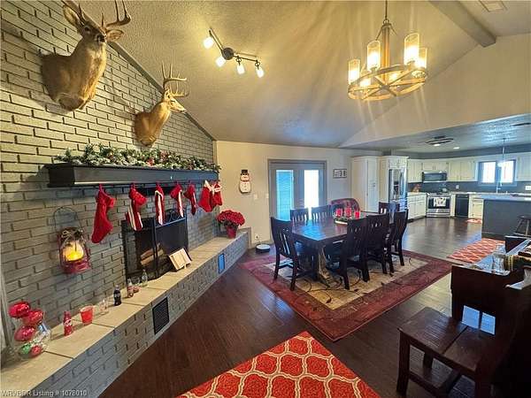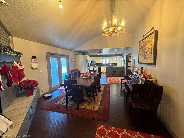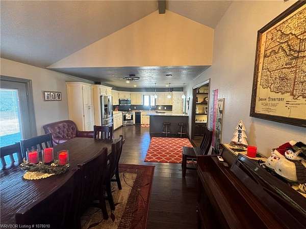 25096 Nobes Road, Howe, OK 74940-a stunning 3-bedroom, 2.5-bath custom-built home situated on 10 picturesque acres. This property seamlessly blends luxury, practicality, and natural beauty, all within minutes of Wister Lake. The tree-studded front yard welcomes you to a charming residence featuring a spacious living area with vaulted ceilings that bathe the home in natural light. The chef's kitchen, complete with elegant granite countertops, flows into a beautiful dining area highlighted by a cozy fireplace, perfect for family moments. This property is tailor-made for country living, offering ample space for raising livestock, growing a thriving garden, and accommodating a large family. Additional highlights include a spacious 2-car garage and a large steel in-ground storm cellar for peace of mind during Oklahoma weather. Don't miss this rare opportunity to own your slice of rural paradise. Schedule your private tour today to experience the charm and functionality of this exceptional home!