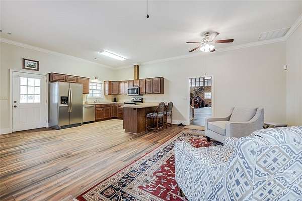 Your new home is set behind an ornamental estate gate, this private 9.58-acre property offers a rare blend of quality construction, usable land, and flexibility. The 1,872 sq ft main residence features 2 bedrooms and 3 full baths, hardwood flooring throughout, 9-foot ceilings, insulated 6-inch walls, and a metal roof with insulation above the ceiling and below roof. Interior highlights include a propane fireplace, accent lighting in the kitchen and dining area, handicap-accessible bathrooms, window shutters, and an exterior repaint completed April 2025. A major asset is the 40 x 72 barn with covered overhangs and an 880 sq ft apartment offering a kitchen, 1 bedroom, 1 bath, walk-in closet, laminate flooring, and washer/dryer connections. Additional features include a 750-ft milled asphalt driveway, landscaped islands, underground utilities, irrigation system, fenced half-acre garden, city water, septic system, established ATV/UTV trails, and multiple outdoor living areas. Ideal for country living.