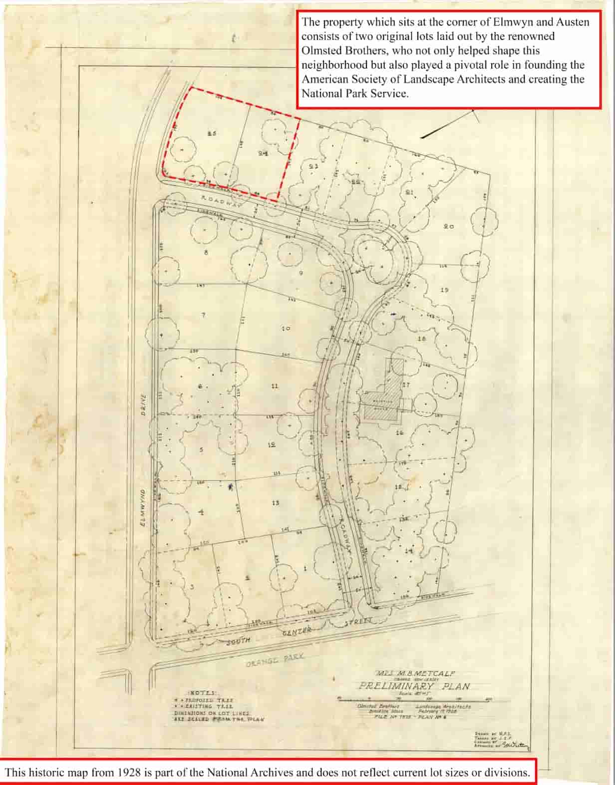 This level, 0.69 acre (30,106 SF) property in the Seven Oaks Historic District of the City of Orange Township, is zoned R-1 and exceeds the minimum lot size by more than twice. Sitting at the corner of Elmwynd and Austen, this single lot property consists of two original lots laid out by the renowned Olmsted Brothers, who not only helped shape this neighborhood but also played a pivotal role in founding the American Society of Landscape Architects and creating the National Park Service.