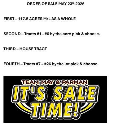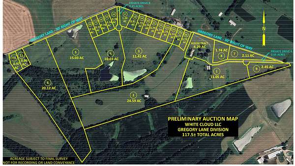 We are having an ABSOLUTE AUCTION for White Cloud LLC of 117.5 acres m/l in 26 tracts located at 251 Gregory Lane Springfield, Ky on May 23rd 10:30am. Tract #1 - 11.05 acres m/l being some cropland with a lake and a barn. Tract #2 - 2.45 acres m/l being a nice building lot. Tract #3 - 11.41 acres m/l with cropland and a nice lake. Tract #4 - 10.03 acres m/l with some cropland and a nice lake. Tract #5 - 15.03 acres m/l with a nice lake, cleared and wooded land. Tract #6 - 20.12 acres m/l with frontage on Gregory Lane offering some cleared land and lots of woods in the rear. Tract #7 - 2.11 acres m/l nice building lot. Tract #8 - 1.74 acres m/l building lot. House tract with 4.29 acres m/l. Tracts #10 & 11 are .96- & .97-acres m/l building lots. Tracts #12 thru #26 range from .73 to 1.20 acres m/l building lots. More information to come. Call or text Monty