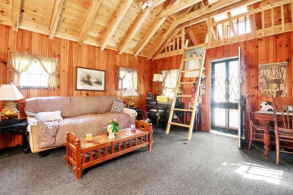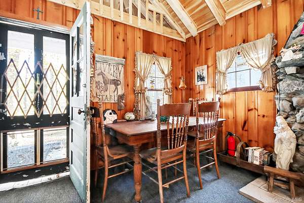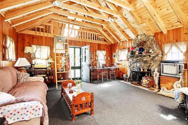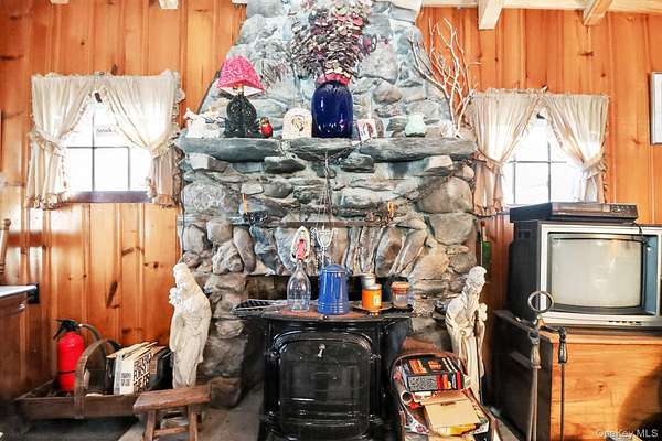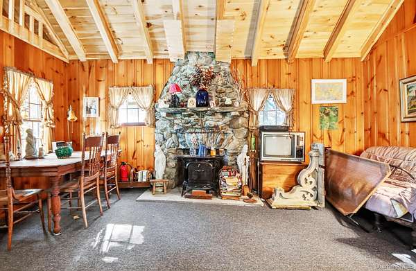 Step inside to experience the warmth of an enormous original stone fireplace, soaring cathedral ceilings, and a brand-new enamel stove with thermal glass doors and fully lined chimney--perfect for cozy evenings after skiing or exploring. A whimsical children's loft with a spy hole greets you above the entry, adding character and charm that make this mountain getaway feel like home. Enjoy the serenity of rural mountaintop living without sacrificing connectivity, thanks to available high-speed internet (Spectrum 1Gbps).