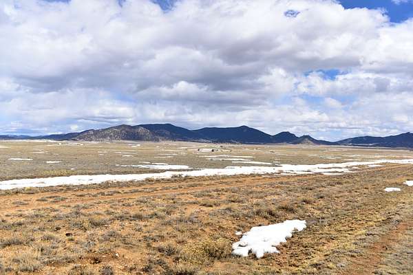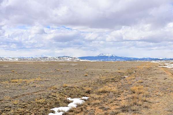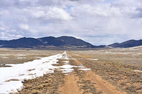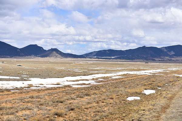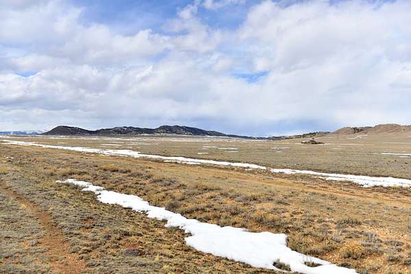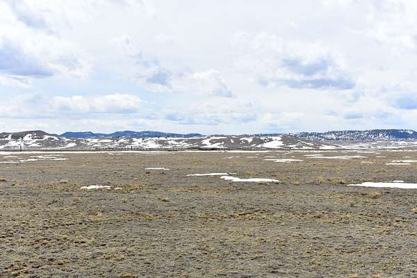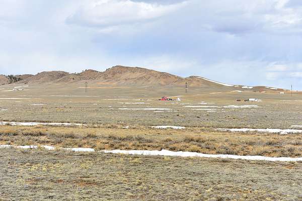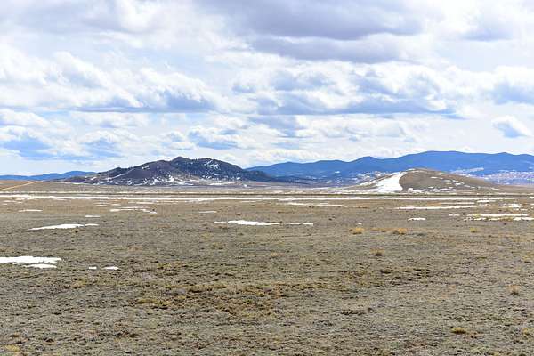 The 5-acre parcel is located in the open high plains of Hartsel, Colorado, with surrounding rolling meadows, low rounded hills, and distant mountain views to the west and southwest. The terrain is largely flat, covered in short grasses with patches of dry soil, and contains no trees, leaving the views unobstructed.