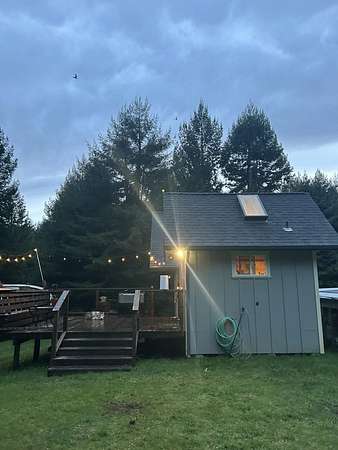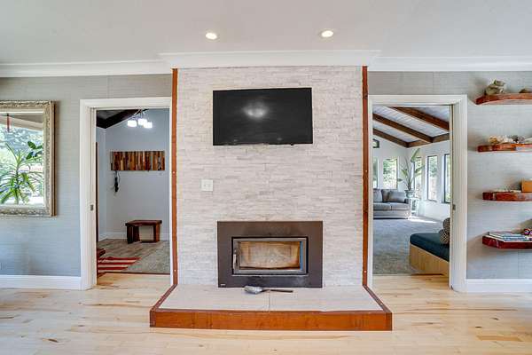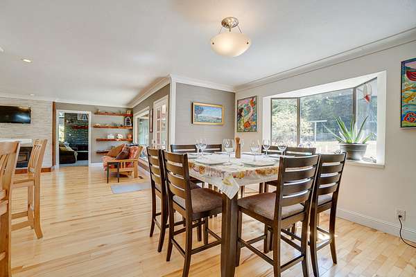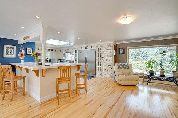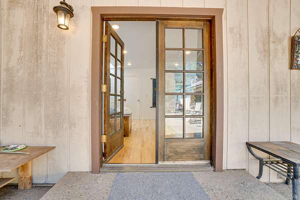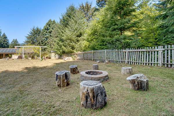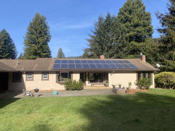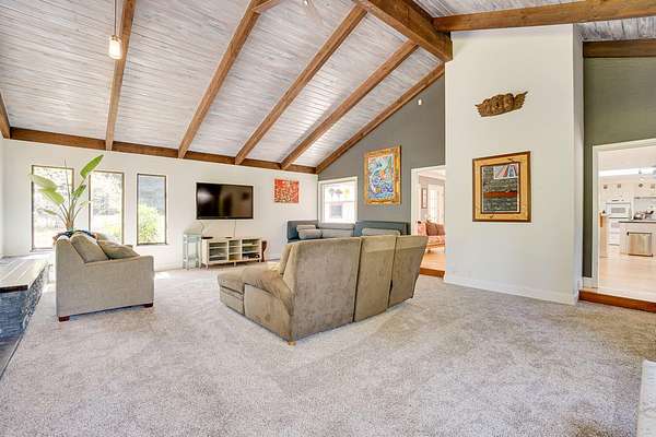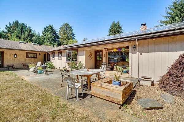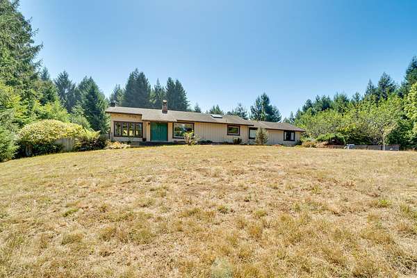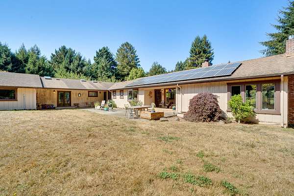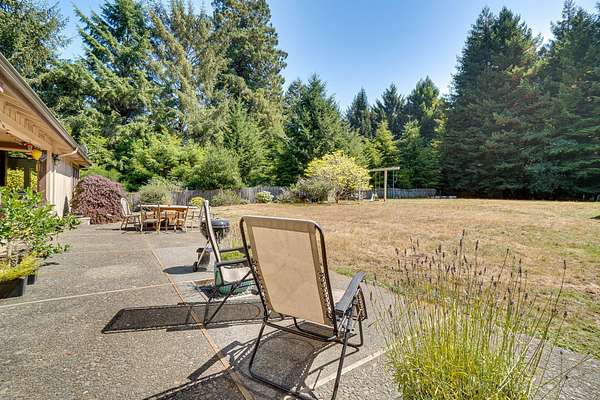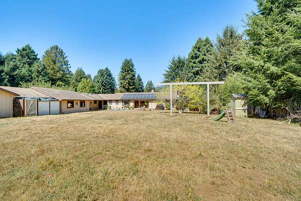 A beautiful classic ranch house with custom contemporary upgrades. This gorgeous home is situated in the middle of a 2.3 acre lot across from the 3rd hole at Baywood Golf and Country Club. Within walking distance to the clubhouse and pool you will find a great place to socialize and recreate. Enter into the great room with cathedral ceilings, a gas stove insert and windows on all sides, providing abundant natural light and a spacious yet cozy feel. Forced air heating throughout the house ensures comfort in each space. Next enter a combo living space with a wood stove insert, dining area and updated kitchen. The kitchen includes a breakfast bar, closeted pantry, and a Wolf island cooktop with downdraft ventilation maximizing counter space. Other premium appliances include Frigidaire dual ovens and refrigerator/freezer. A door opens conveniently to the back patio for outdoor access. Starting down the hall is the first updated bathroom with a pedestal sink and shower. Continuing down the hall, there is the indoor laundry room with patio access, and 3 large bedrooms. Making the turn you will find the second updated bathroom with a modern granite topped vanity and new tile around the shower tub combo and on the floor. Finally make your way into the luxurious primary suite. Inside find a large walk in closet, a fully remodeled bathroom with 2 sinks on an oversized vanity, walk in shower and a deep soaking tub perfect for relaxation. Your feet will love staying warm on the radiant heated floors as you ready yourself for every occasion. French doors leading out to the backyard and patio round out this elegant suite. In addition to the wonderful living space you will find plenty of room for automobiles, boats, ATV's or motor bikes in the oversized 2 car garage and attached carport. A separate RV parking area with 50 amp service can be found at the back of the property. External storage sheds provide extra room for tools, recreation equipment or whatever else needs protection from the elements. In the back are two large water tanks for storing water from your private well as well as covered wood sheds. Mounted on the roof is a 7 KW solar system with the ability to add more panels to offset charges on your energy bill and skylights have been modernized to Velux models. Finally, near the back of the lot, are two casitas joined by a deck that together make an ADU. One casita serves as the kitchen space while the other serves as the sleeping and living space. Large pasture areas in the front or back could serve for 4H purposes or horse ownership. This property truly has it all in a highly sought after location. Don't let this rare opportunity to own such a unique property pass by.